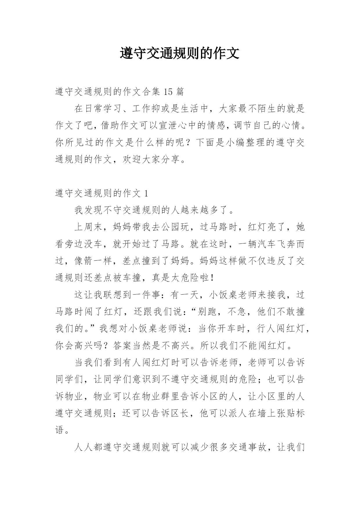 遵守交通规则的作文遵守交通规则的作文合集15篇在日常学习、工作抑或是生活中,大家最不陌生的就是作文了吧,借助作文可以宣泄心中的情感,调节自己的心情。你所见过的作文是什么样的呢?下面是小编整理的遵守交通规则的作文,欢迎大家分享。遵守交通规则的作文1我发现不守交通规则的人越来越多了。上周末,妈妈带我去公园玩,过马路时,红灯亮了,她看旁边没车,就开始过了马路。就在这时,一辆汽车飞奔而过,像箭一样,差点撞到了妈妈。妈妈这样做不仅违反了交通规则还差点被车撞,真是太危险啦!这让我联想到一件事:有一天,小饭桌老师来接我