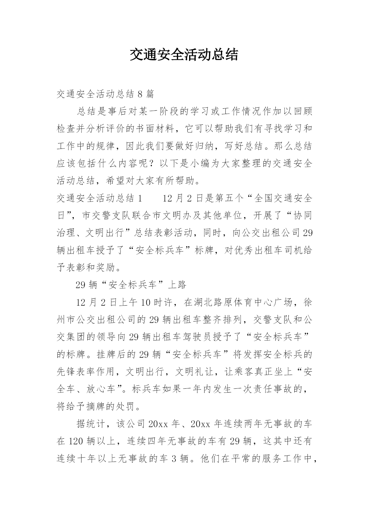交通安全活动总结交通安全活动总结8篇总结是事后对某一阶段的学习或工作情况作加以回顾检查并分析评价的书面材料,它可以帮助我们有寻找学习和工作中的规律,因此我们要做好归纳,写好总结。那么总结应该包括什么内容呢?以下是小编为大家整理的交通安全活动总结,希望对大家有所帮助。交通安全活动总结112月2日是第五个“全国交通安全日”,市交警支队联合市文明办及其他单位,开展了“协同治理、文明出行”总结表彰活动,同时,向公交出租公司29辆出租车授予了“安全标兵车”标牌,对优秀出租车司机给予表彰和奖励。29辆“安全标兵车”上