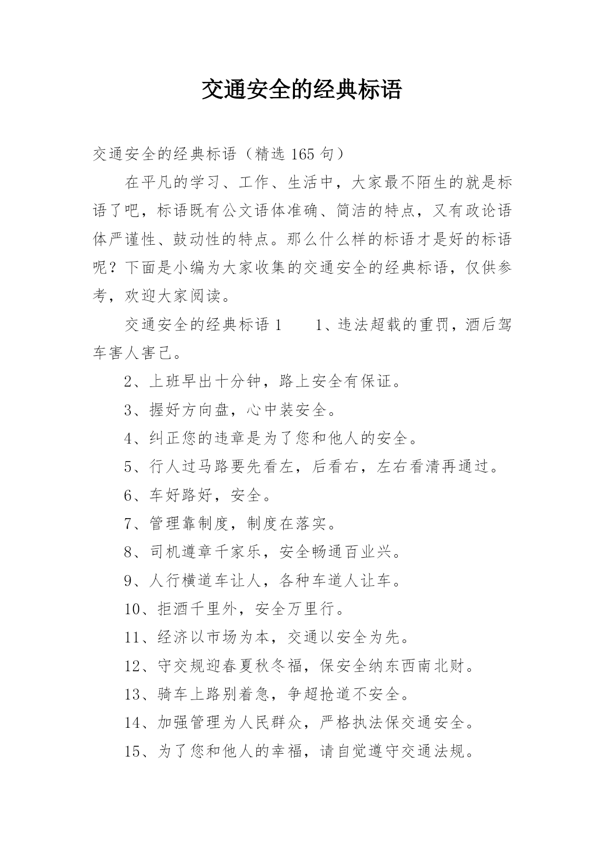 交通安全的经典标语交通安全的经典标语(精选165句)在平凡的学习、工作、生活中,大家最不陌生的就是标语了吧,标语既有公文语体准确、简洁的特点,又有政论语体严谨性、鼓动性的特点。那么什么样的标语才是好的标语呢?下面是小编为大家收集的交通安全的经典标语,仅供参考,欢迎大家阅读。交通安全的经典标语11、违法超载的重罚,酒后驾车害人害己。2、上班早出十分钟,路上安全有保证。3、握好方向盘,心中装安全。4、纠正您的违章是为了您和他人的安全。5、行人过马路要先看左,后看右,左右看清再通过。6、车好路好,安全。7、管理