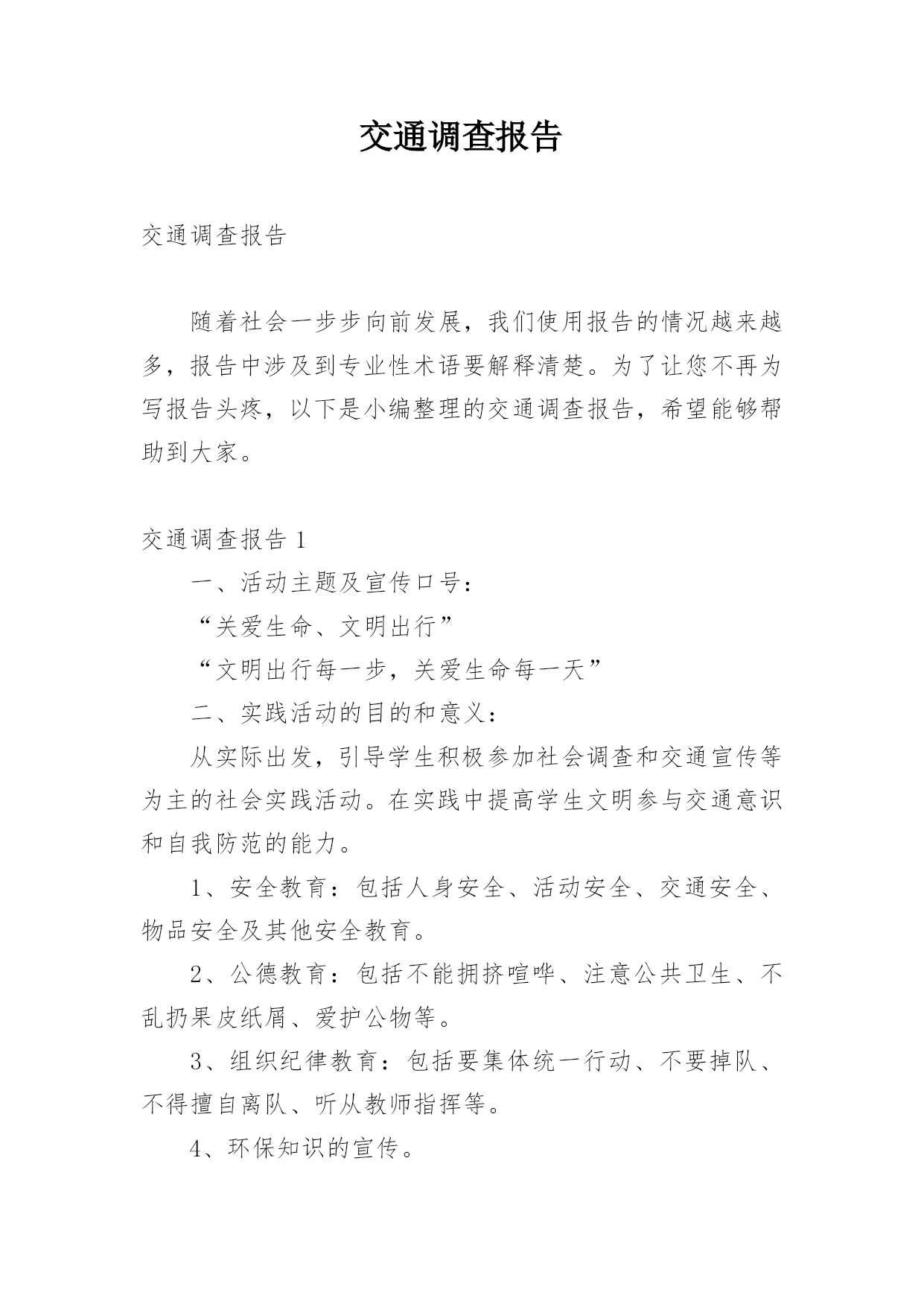 交通调查报告交通调查报告随着社会一步步向前发展,我们使用报告的情况越来越多,报告中涉及到专业性术语要解释清楚。为了让您不再为写报告头疼,以下是小编整理的交通调查报告,希望能够帮助到大家。交通调查报告1一、活动主题及宣传口号:“关爱生命、文明出行”“文明出行每一步,关爱生命每一天”二、实践活动的目的和意义:从实际出发,引导学生积极参加社会调查和交通宣传等为主的社会实践活动。在实践中提高学生文明参与交通意识和自我防范的能力。1、安全教育:包括人身安全、活动安全、交通安全、物品安全及其他安全教育。2、公德教育: