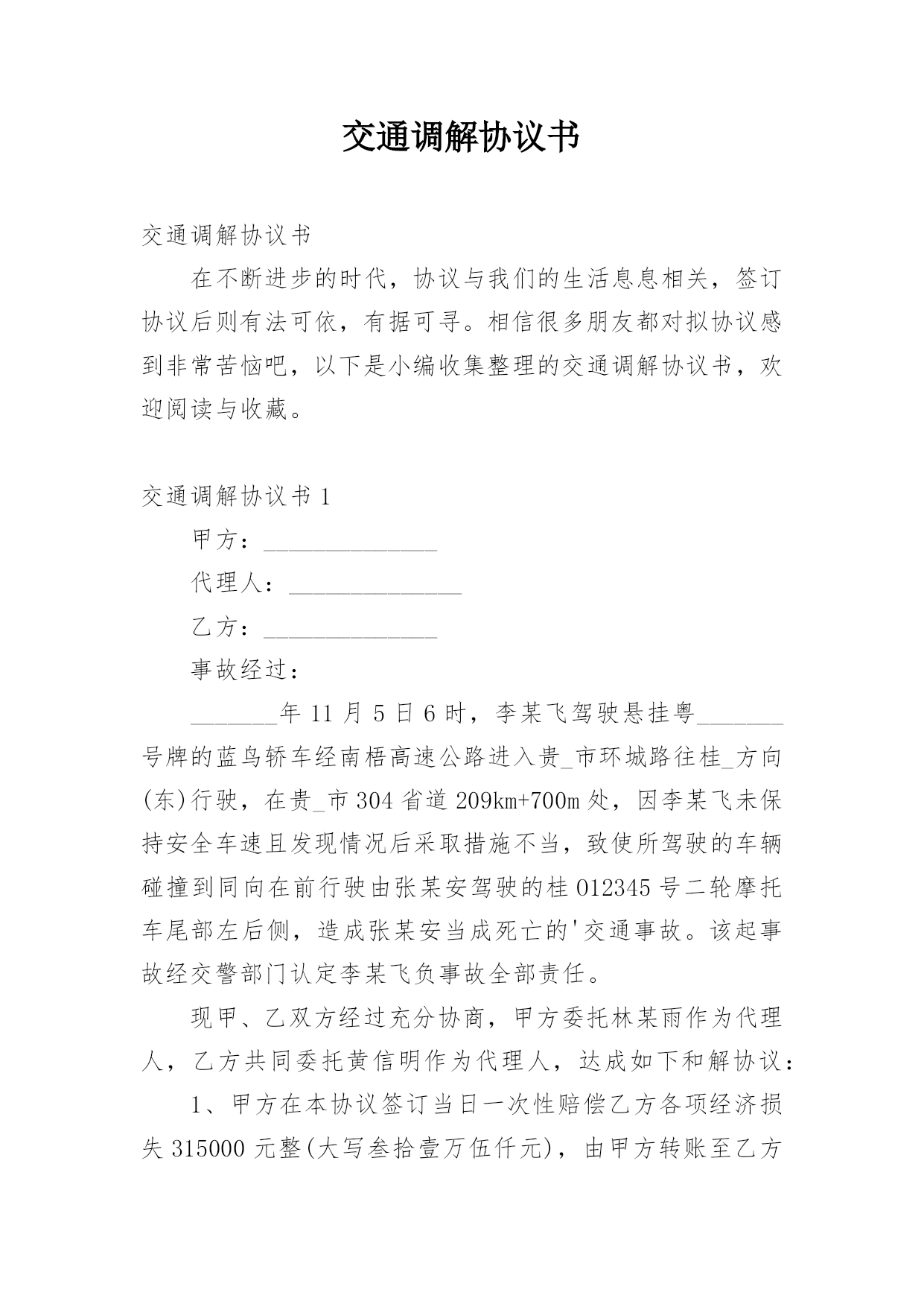 交通调解协议书交通调解协议书在不断进步的时代,协议与我们的生活息息相关,签订协议后则有法可依,有据可寻。相信很多朋友都对拟协议感到非常苦恼吧,以下是小编收集整理的交通调解协议书,欢迎阅读与收藏。交通调解协议书1甲方:______________代理人:______________乙方:______________事故经过:_______年11月5日6时,李某飞驾驶悬挂粤_______号牌的蓝鸟轿车经南梧高速公路进入贵_市环城路往桂_方向(东)行驶,在贵_市304省道209km+700m处,因李某飞未保持安