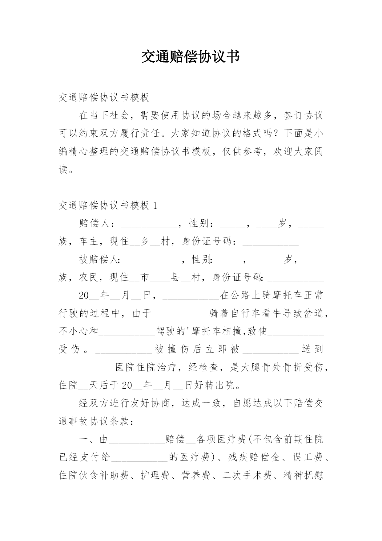交通赔偿协议书交通赔偿协议书模板在当下社会,需要使用协议的场合越来越多,签订协议可以约束双方履行责任。大家知道协议的格式吗?下面是小编精心整理的交通赔偿协议书模板,仅供参考,欢迎大家阅读。交通赔偿协议书模板1赔偿人:___________,性别:_____,____岁,_____族,车主,现住__乡__村,身份证号码:___________被赔偿人:___________,性别:_____,______岁,____族,农民,现住__市____县__村,身份证号码:___________20__年__月__