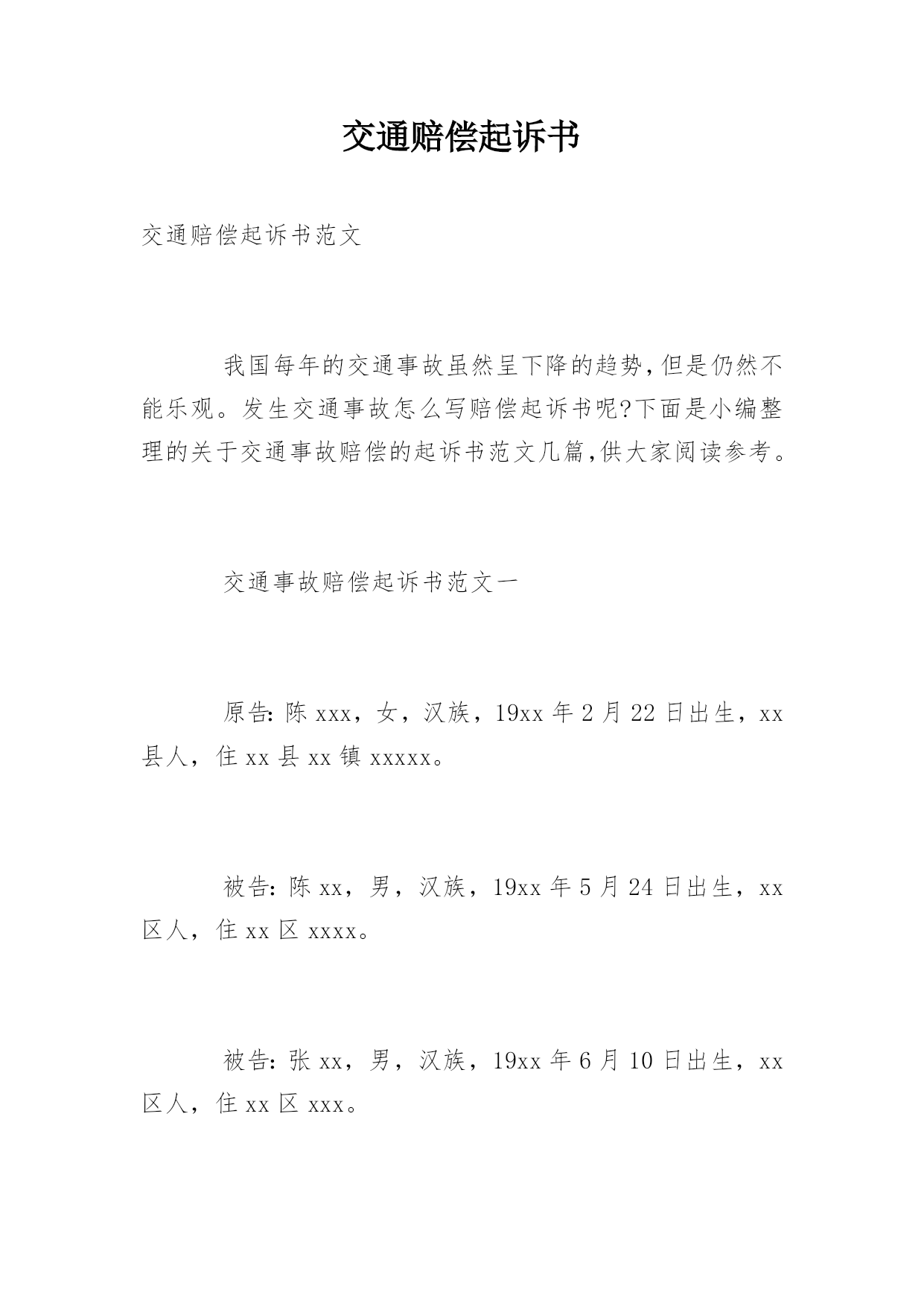 交通赔偿起诉书交通赔偿起诉书范文我国每年的交通事故虽然呈下降的趋势,但是仍然不能乐观。发生交通事故怎么写赔偿起诉书呢?下面是小编整理的关于交通事故赔偿的起诉书范文几篇,供大家阅读参考。交通事故赔偿起诉书范文一原告:陈xxx,女,汉族,19xx年2月22日出生,xx县人,住xx县xx镇xxxxx。被告:陈xx,男,汉族,19xx年5月24日出生,xx区人,住xx区xxxx。被告:张xx,男,汉族,19xx年6月10日出生,xx区人,住xx区xxx。诉讼请求:1、依法判令两被告连带赔偿原告的经济损失共计238