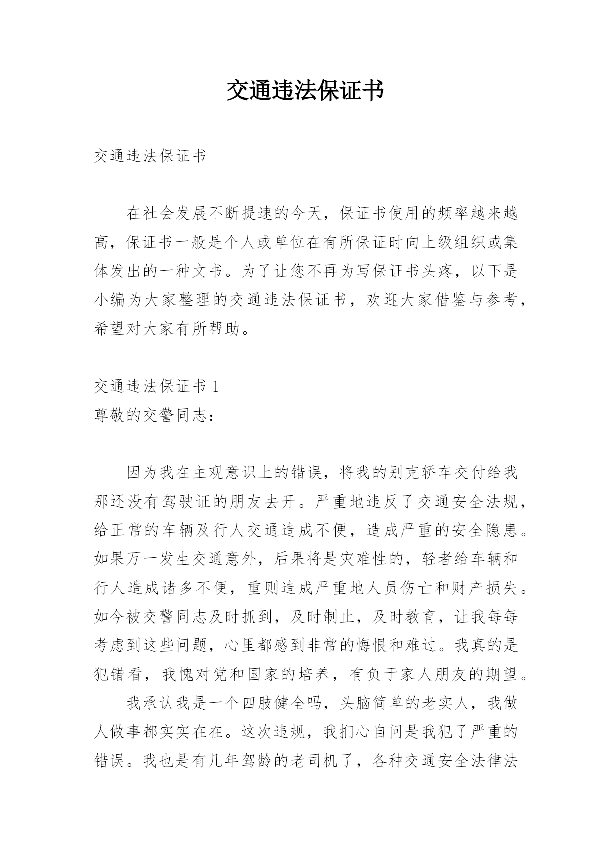 交通违法保证书交通违法保证书在社会发展不断提速的今天,保证书使用的频率越来越高,保证书一般是个人或单位在有所保证时向上级组织或集体发出的一种文书。为了让您不再为写保证书头疼,以下是小编为大家整理的交通违法保证书,欢迎大家借鉴与参考,希望对大家有所帮助。交通违法保证书1尊敬的交警同志:因为我在主观意识上的错误,将我的别克轿车交付给我那还没有驾驶证的朋友去开。严重地违反了交通安全法规,给正常的车辆及行人交通造成不便,造成严重的安全隐患。如果万一发生交通意外,后果将是灾难性的,轻者给车辆和行人造成诸多不便,重则