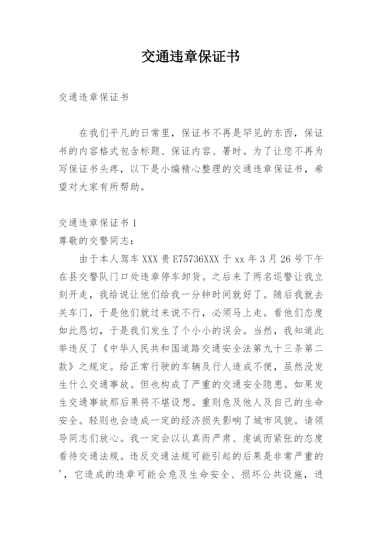 交通违章保证书交通违章保证书在我们平凡的日常里,保证书不再是罕见的东西,保证书的内容格式包含标题、保证内容、署时。为了让您不再为写保证书头疼,以下是小编精心整理的交通违章保证书,希望对大家有所帮助。交通违章保证书1尊敬的交警同志:由于本人驾车XXX贵E75736XXX于xx年3月26号下午在县交警队门口处违章停车卸货。之后来了两名巡警让我立刻开走,我给说让他们给我一分钟时间就好了。随后我就去关车门,于是他们就过来说不行,必须马上走。看他们态度如此恳切,于是我们发生了个小小的误会。当然,我知道此举违反了《中