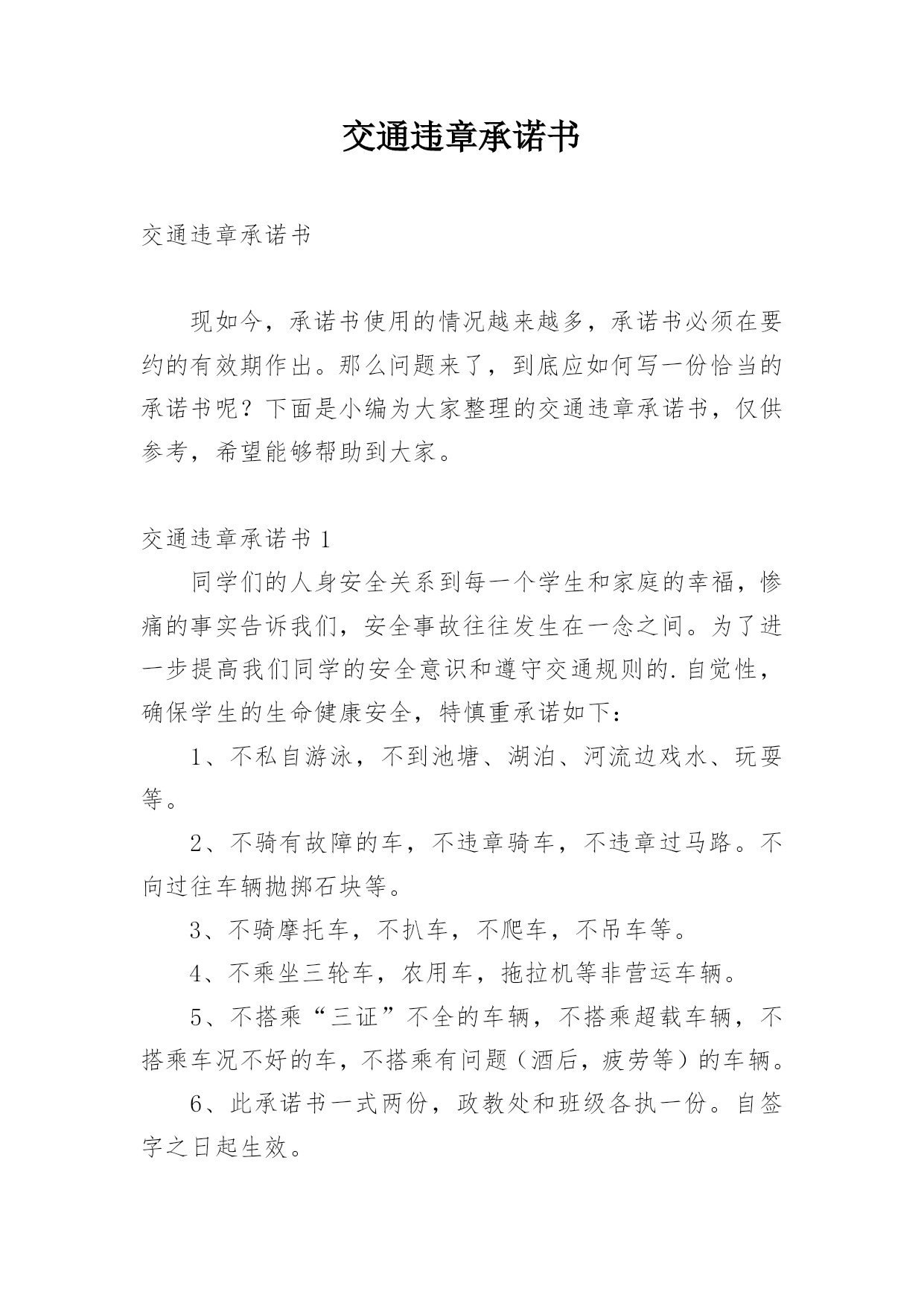 交通违章承诺书交通违章承诺书现如今,承诺书使用的情况越来越多,承诺书必须在要约的有效期作出。那么问题来了,到底应如何写一份恰当的承诺书呢?下面是小编为大家整理的交通违章承诺书,仅供参考,希望能够帮助到大家。交通违章承诺书1同学们的人身安全关系到每一个学生和家庭的幸福,惨痛的事实告诉我们,安全事故往往发生在一念之间。为了进一步提高我们同学的安全意识和遵守交通规则的.自觉性,确保学生的生命健康安全,特慎重承诺如下:1、不私自游泳,不到池塘、湖泊、河流边戏水、玩耍等。2、不骑有故障的车,不违章骑车,不违章过马路