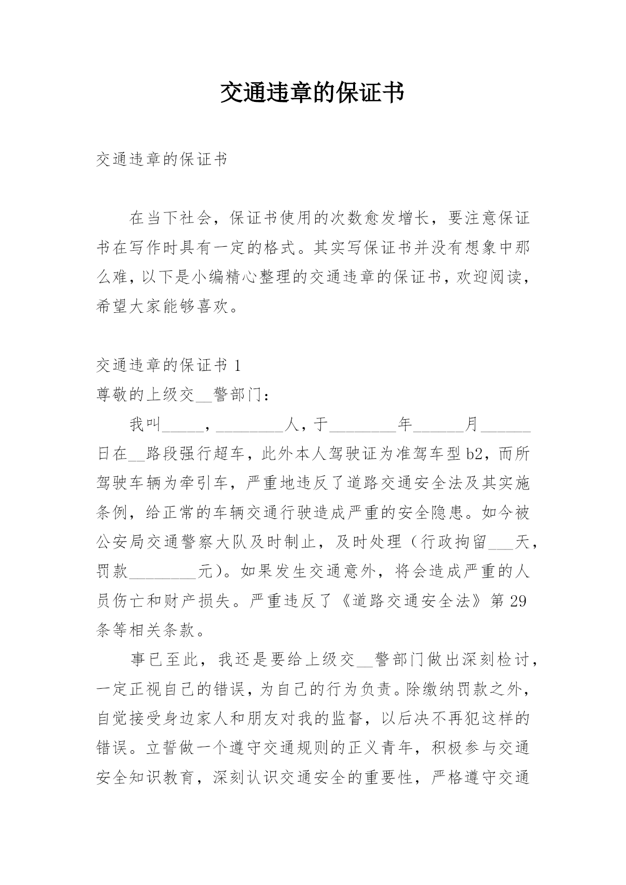 交通违章的保证书交通违章的保证书在当下社会,保证书使用的次数愈发增长,要注意保证书在写作时具有一定的格式。其实写保证书并没有想象中那么难,以下是小编精心整理的交通违章的保证书,欢迎阅读,希望大家能够喜欢。交通违章的保证书1尊敬的上级交__警部门:我叫_____,________人,于________年______月______日在__路段强行超车,此外本人驾驶证为准驾车型b2,而所驾驶车辆为牵引车,严重地违反了道路交通安全法及其实施条例,给正常的车辆交通行驶造成严重的安全隐患。如今被公安局交通警察大队及时