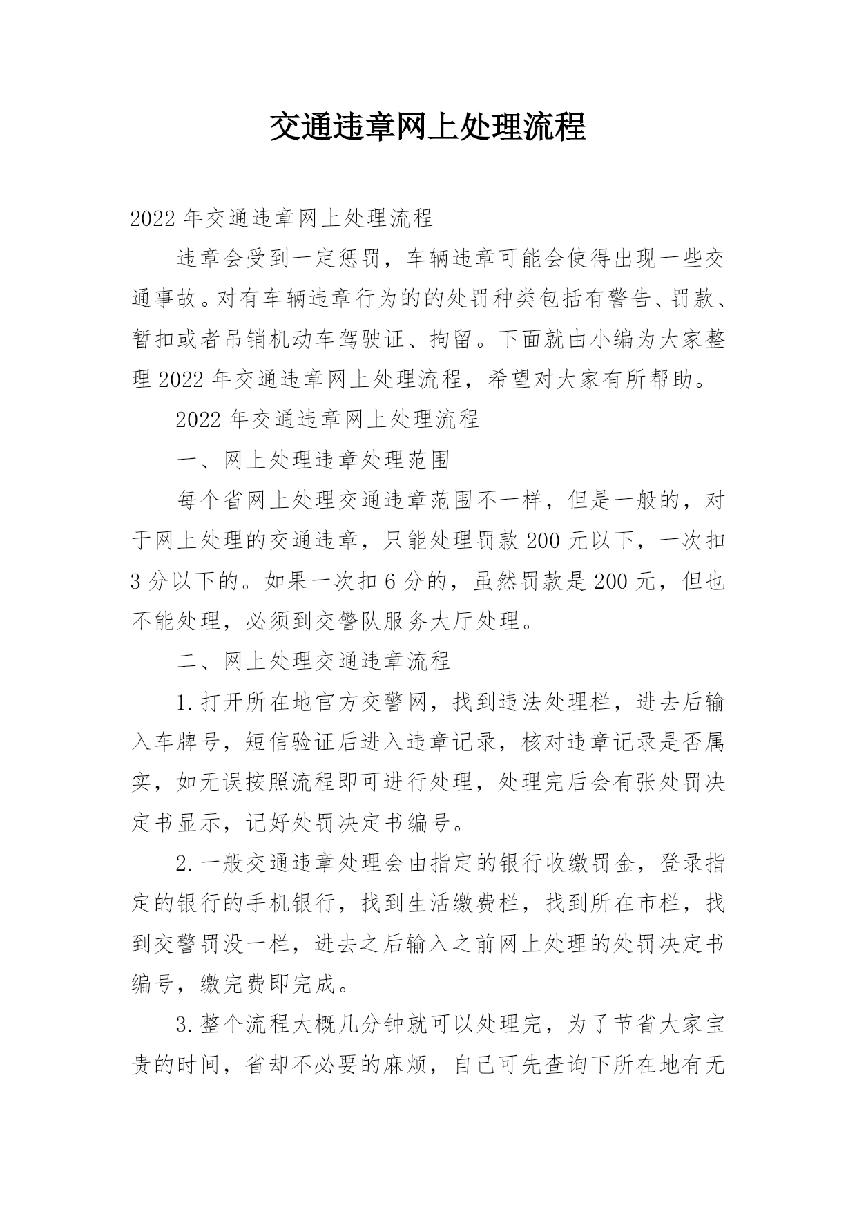 交通违章网上处理流程2022年交通违章网上处理流程违章会受到一定惩罚,车辆违章可能会使得出现一些交通事故。对有车辆违章行为的的处罚种类包括有警告、罚款、暂扣或者吊销机动车驾驶证、拘留。下面就由小编为大家整理2022年交通违章网上处理流程,希望对大家有所帮助。2022年交通违章网上处理流程一、网上处理违章处理范围每个省网上处理交通违章范围不一样,但是一般的,对于网上处理的交通违章,只能处理罚款200元以下,一次扣3分以下的。如果一次扣6分的,虽然罚款是200元,但也不能处理,必须到交警队服务大厅处理。二、网
