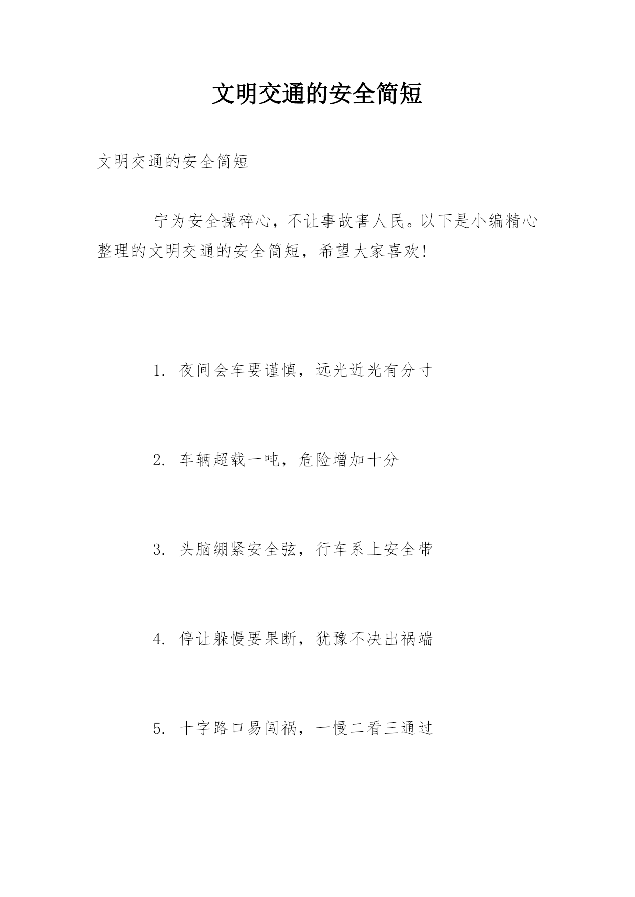文明交通的安全简短文明交通的安全简短宁为安全操碎心,不让事故害人民。以下是小编精心整理的文明交通的安全简短,希望大家喜欢!1.夜间会车要谨慎,远光近光有分寸2.车辆超载一吨,危险增加十分3.头脑绷紧安全弦,行车系上安全带4.停让躲慢要果断,犹豫不决出祸端5.十字路口易闯祸,一慢二看三通过6.实线虚线斑马线,都是生命安全线7.拒酒千里外,安全万里行8.违章铸成终身悔,守规伴你一世安9.礼让礼让,人车无恙10.礼让三先,路畅民安11.宁绕百步远,不抢一步险12.减速慢行勿争先,关照生命到永远13.遵守交规,储