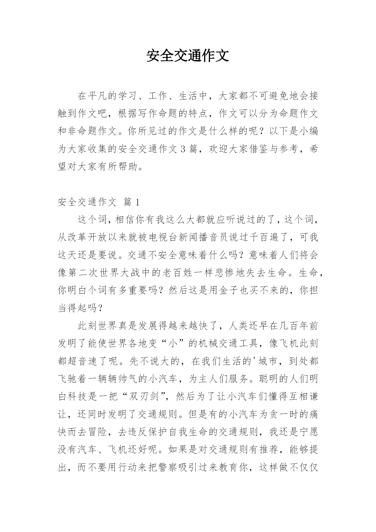 安全交通作文在平凡的学习、工作、生活中,大家都不可避免地会接触到作文吧,根据写作命题的特点,作文可以分为命题作文和非命题作文。你所见过的作文是什么样的呢?以下是小编为大家收集的安全交通作文3篇,欢迎大家借鉴与参考,希望对大家有所帮助。安全交通作文篇1这个词,相信你有我这么大都就应听说过的了,这个词,从改革开放以来就被电视台新闻播音员说过千百遍了,可我这天还是要说。交通不安全意味着什么吗?意味着人们将会像第二次世界大战中的老百姓一样悲惨地失去生命。生命,你明白个词有多重要吗?然后这是用金子也买不来的,你担当