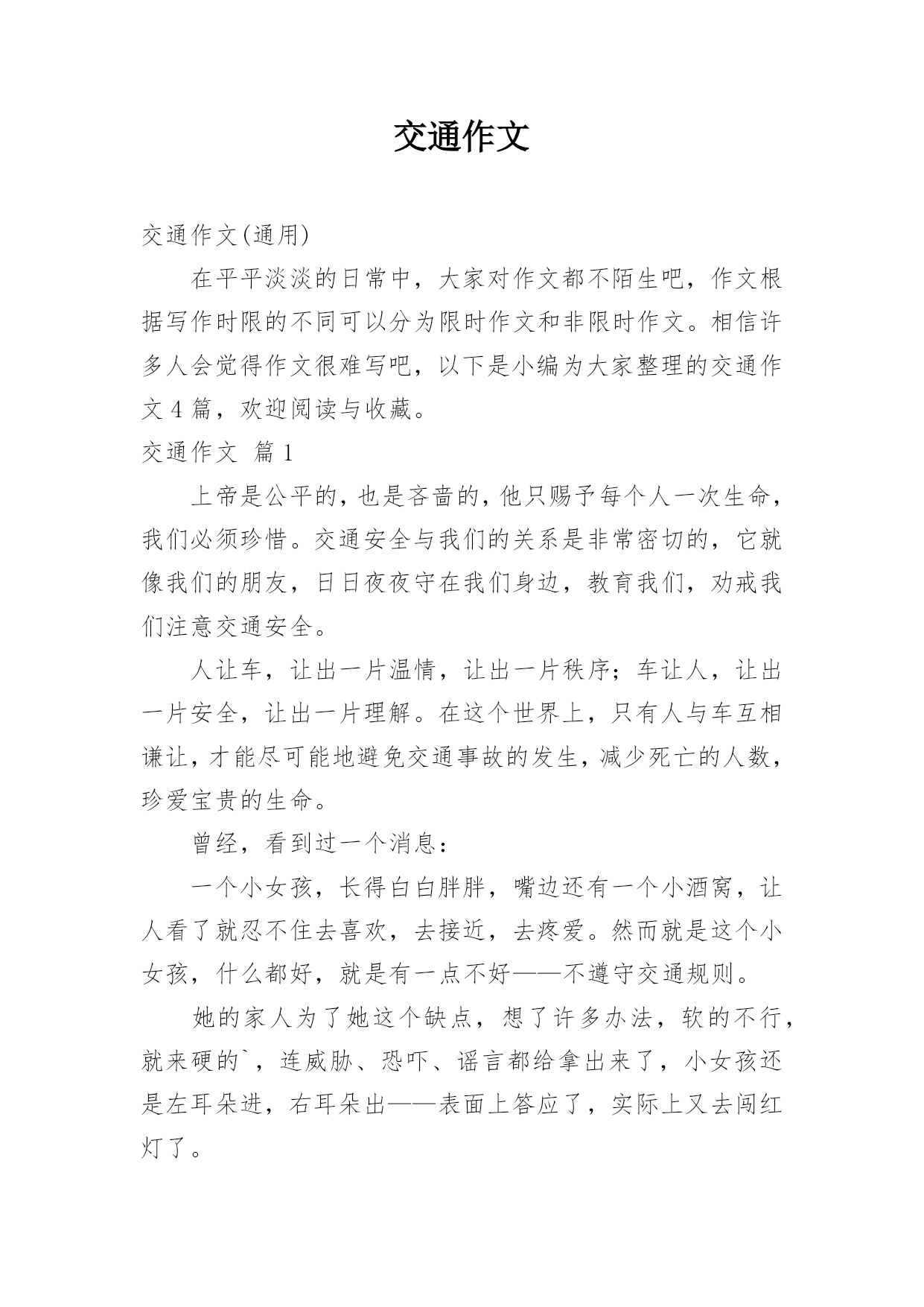 交通作文交通作文(通用)在平平淡淡的日常中,大家对作文都不陌生吧,作文根据写作时限的不同可以分为限时作文和非限时作文。相信许多人会觉得作文很难写吧,以下是小编为大家整理的交通作文4篇,欢迎阅读与收藏。交通作文篇1上帝是公平的,也是吝啬的,他只赐予每个人一次生命,我们必须珍惜。交通安全与我们的关系是非常密切的,它就像我们的朋友,日日夜夜守在我们身边,教育我们,劝戒我们注意交通安全。人让车,让出一片温情,让出一片秩序;车让人,让出一片安全,让出一片理解。在这个世界上,只有人与车互相谦让,才能尽可能地避免交通事