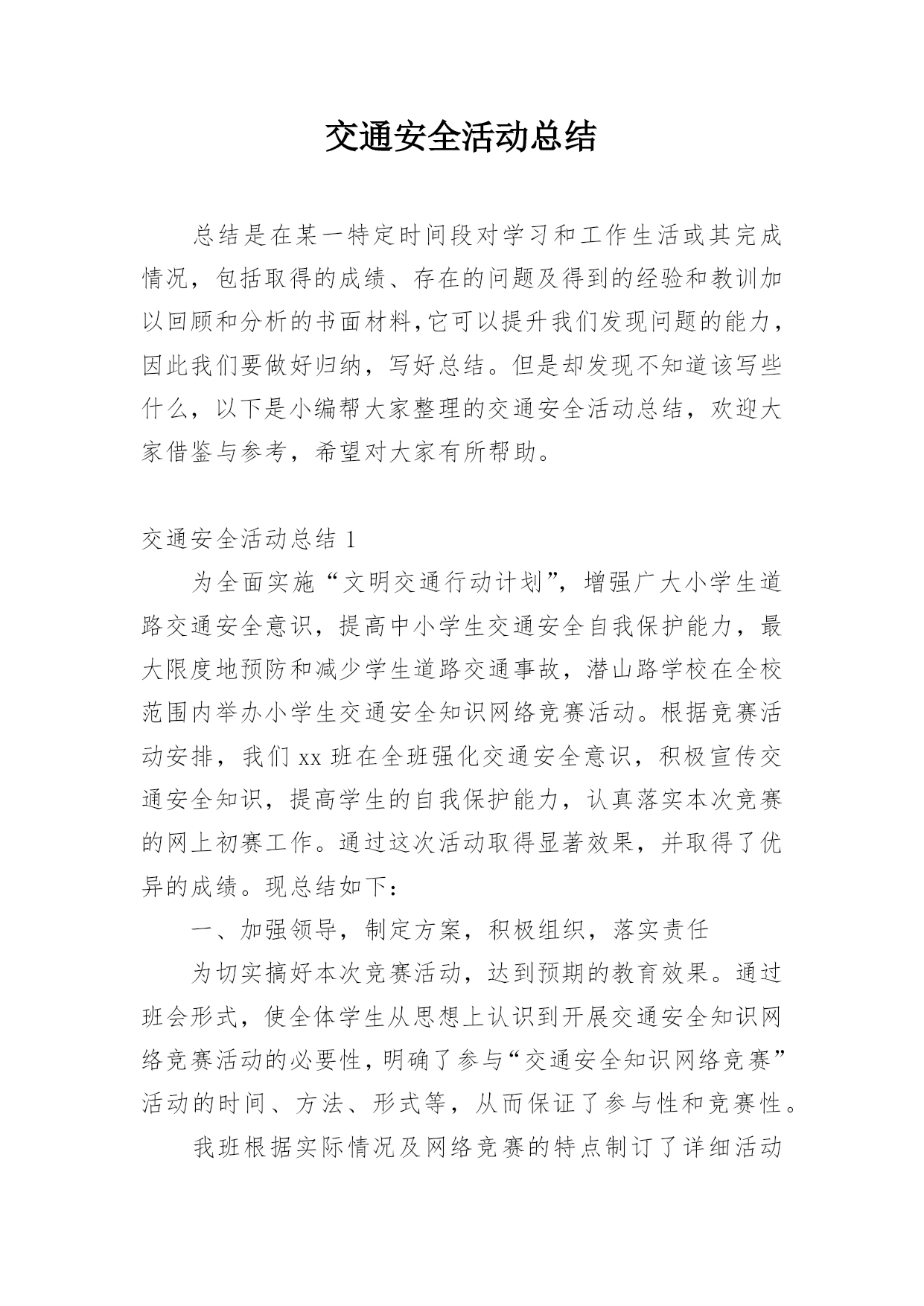 交通安全活动总结总结是在某一特定时间段对学习和工作生活或其完成情况,包括取得的成绩、存在的问题及得到的经验和教训加以回顾和分析的书面材料,它可以提升我们发现问题的能力,因此我们要做好归纳,写好总结。但是却发现不知道该写些什么,以下是小编帮大家整理的交通安全活动总结,欢迎大家借鉴与参考,希望对大家有所帮助。交通安全活动总结1为全面实施“文明交通行动计划”,增强广大小学生道路交通安全意识,提高中小学生交通安全自我保护能力,最大限度地预防和减少学生道路交通事故,潜山路学校在全校范围内举办小学生交通安全知识网络竞
