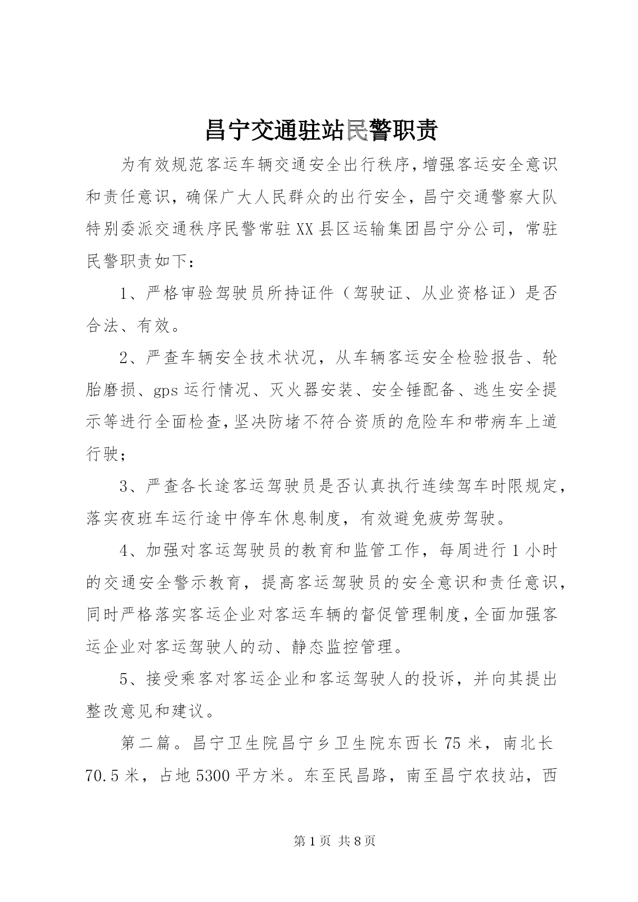 第PAGE\*Arabic\*MERGEFORMAT8页共NUMPAGES\*MERGEFORMAT8页昌宁交通驻站民警职责为有效规范客运车辆交通安全出行秩序,增强客运安全意识和责任意识,确保广大人民群众的出行安全,昌宁交通警察大队特别委派交通秩序民警常驻XX县区运输集团昌宁分公司,常驻民警职责如下:1、严格审验驾驶员所持证件(驾驶证、从业资格证)是否合法、有效。2、严查车辆安全技术状况,从车辆客运安全检验报告、轮胎磨损、gps运行情况、灭火器安装、安全锤配备、逃生安全提示等进行全面检查,坚决