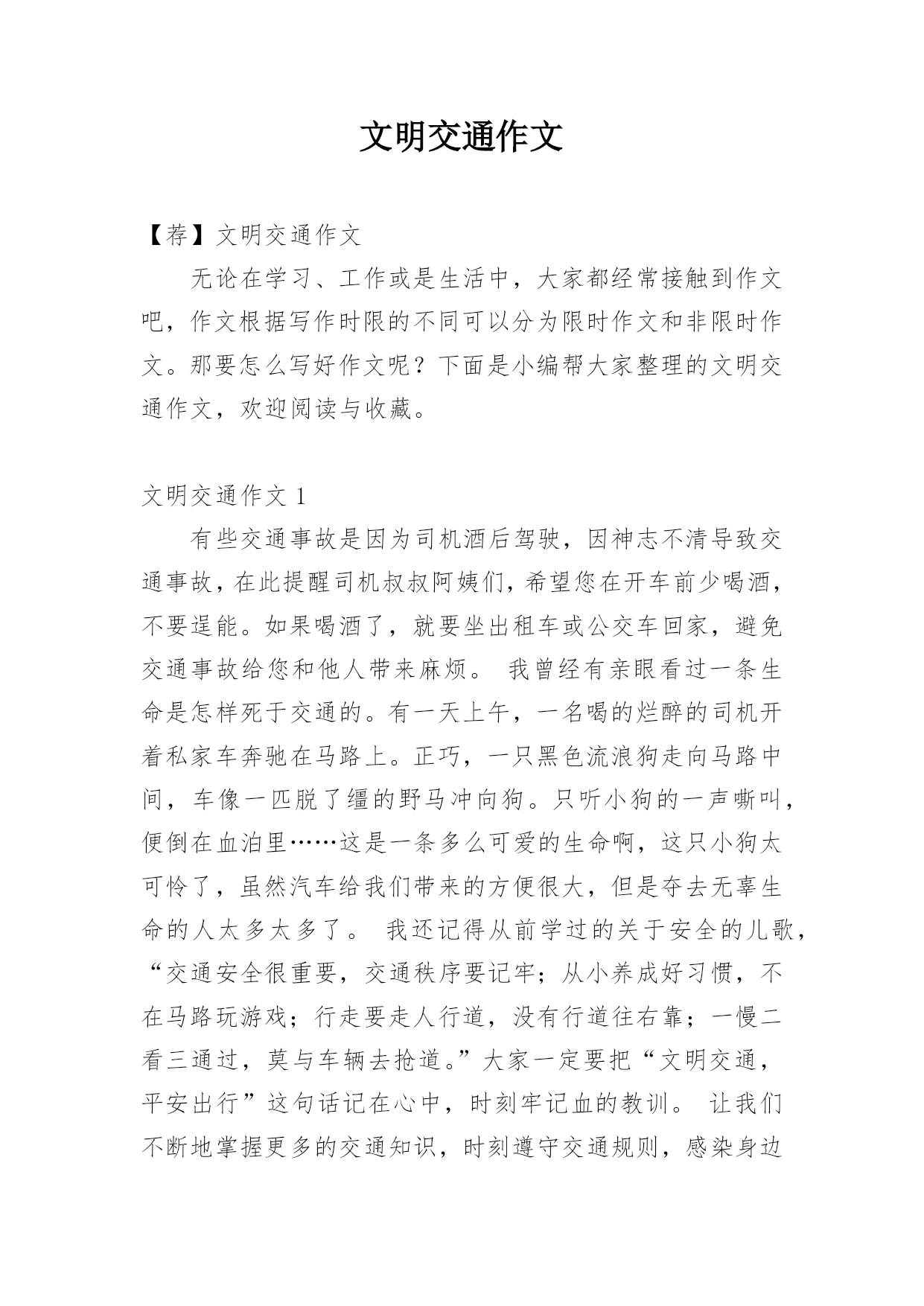 文明交通作文【荐】文明交通作文无论在学习、工作或是生活中,大家都经常接触到作文吧,作文根据写作时限的不同可以分为限时作文和非限时作文。那要怎么写好作文呢?下面是小编帮大家整理的文明交通作文,欢迎阅读与收藏。文明交通作文1有些交通事故是因为司机酒后驾驶,因神志不清导致交通事故,在此提醒司机叔叔阿姨们,希望您在开车前少喝酒,不要逞能。如果喝酒了,就要坐出租车或公交车回家,避免交通事故给您和他人带来麻烦。我曾经有亲眼看过一条生命是怎样死于交通的。有一天上午,一名喝的烂醉的司机开着私家车奔驰在马路上。正巧,一只黑