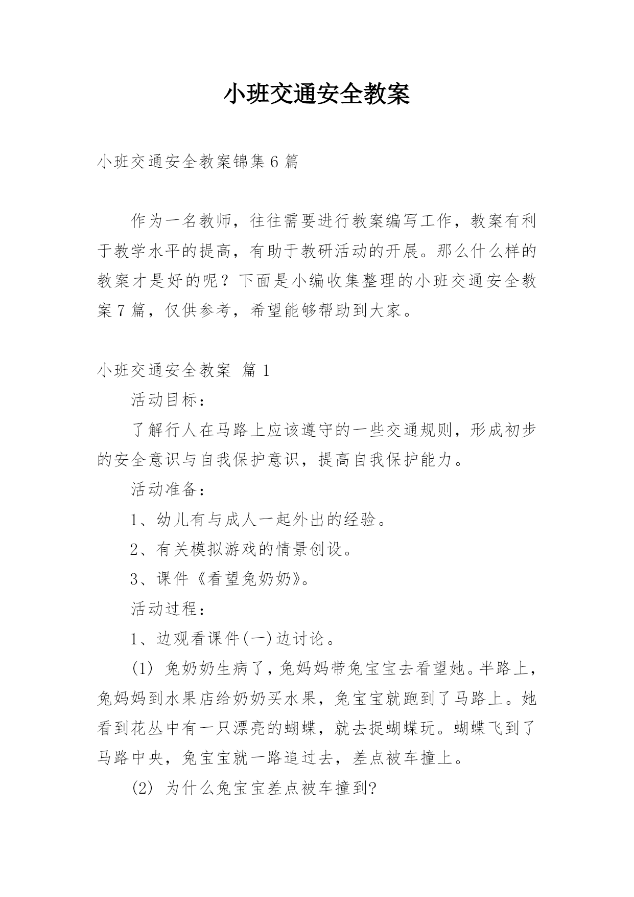 小班交通安全教案小班交通安全教案锦集6篇作为一名教师,往往需要进行教案编写工作,教案有利于教学水平的提高,有助于教研活动的开展。那么什么样的教案才是好的呢?下面是小编收集整理的小班交通安全教案7篇,仅供参考,希望能够帮助到大家。小班交通安全教案篇1活动目标:了解行人在马路上应该遵守的一些交通规则,形成初步的安全意识与自我保护意识,提高自我保护能力。活动准备:1、幼儿有与成人一起外出的经验。2、有关模拟游戏的情景创设。3、课件《看望兔奶奶》。活动过程:1、边观看课件(一)边讨论。(1)兔奶奶生病了,兔妈妈带