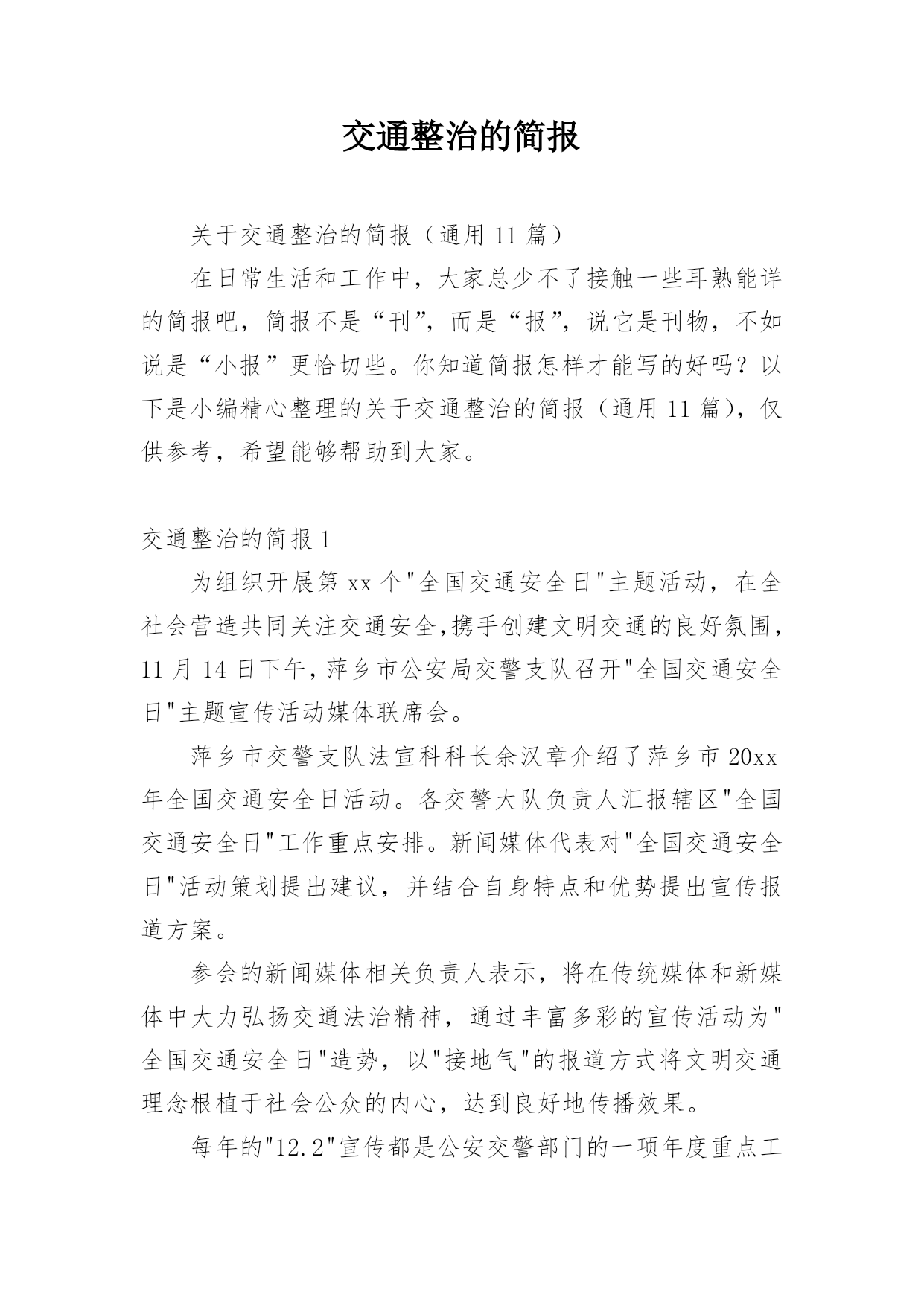 交通整治的简报关于交通整治的简报(通用11篇)在日常生活和工作中,大家总少不了接触一些耳熟能详的简报吧,简报不是“刊”,而是“报”,说它是刊物,不如说是“小报”更恰切些。你知道简报怎样才能写的好吗?以下是小编精心整理的关于交通整治的简报(通用11篇),仅供参考,希望能够帮助到大家。交通整治的简报1为组织开展第xx个"全国交通安全日"主题活动,在全社会营造共同关注交通安全,携手创建文明交通的良好氛围,11月14日下午,萍乡市公安局交警支队召开"全国交通安全日"主题宣传活动媒体联席会。萍乡市交警支队法宣科科长