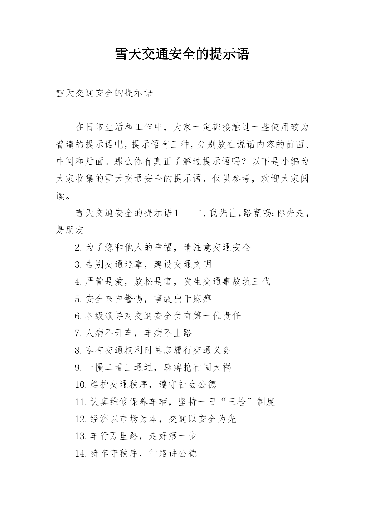 雪天交通安全的提示语雪天交通安全的提示语在日常生活和工作中,大家一定都接触过一些使用较为普遍的提示语吧,提示语有三种,分别放在说话内容的前面、中间和后面。那么你有真正了解过提示语吗?以下是小编为大家收集的雪天交通安全的提示语,仅供参考,欢迎大家阅读。雪天交通安全的提示语11.我先让,路宽畅;你先走,是朋友2.为了您和他人的幸福,请注意交通安全3.告别交通违章,建设交通文明4.严管是爱,放松是害,发生交通事故坑三代5.安全来自警惕,事故出于麻痹6.各级领导对交通安全负有第一位责任7.人病不开车,车病不上路8