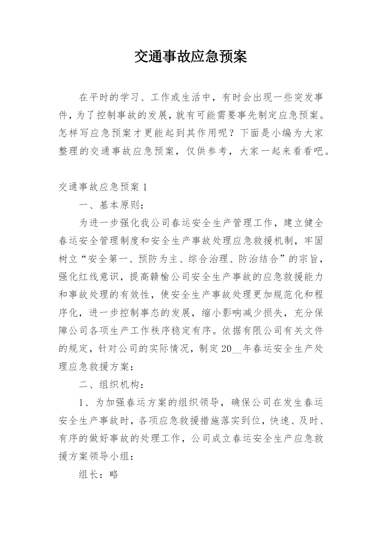 交通事故应急预案在平时的学习、工作或生活中,有时会出现一些突发事件,为了控制事故的发展,就有可能需要事先制定应急预案。怎样写应急预案才更能起到其作用呢?下面是小编为大家整理的交通事故应急预案,仅供参考,大家一起来看看吧。交通事故应急预案1一、基本原则:为进一步强化我公司春运安全生产管理工作,建立健全春运安全管理制度和安全生产事故处理应急救援机制,牢固树立“安全第一、预防为主、综合治理、防治结合”的宗旨,强化红线意识,提高赣榆公司安全生产事故的应急救援能力和事故处理的有效性,使安全生产事故处理更加规范化和程