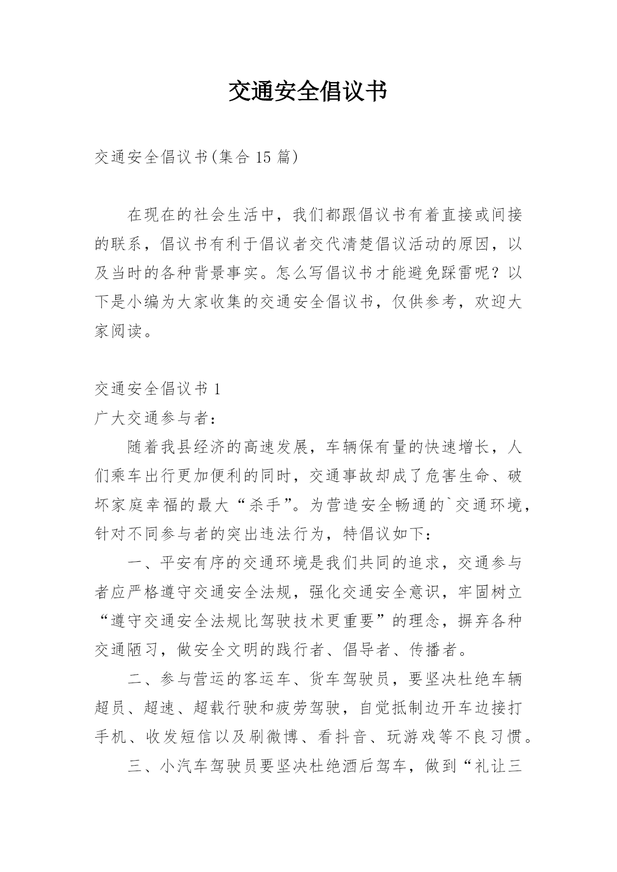 交通安全倡议书交通安全倡议书(集合15篇)在现在的社会生活中,我们都跟倡议书有着直接或间接的联系,倡议书有利于倡议者交代清楚倡议活动的原因,以及当时的各种背景事实。怎么写倡议书才能避免踩雷呢?以下是小编为大家收集的交通安全倡议书,仅供参考,欢迎大家阅读。交通安全倡议书1广大交通参与者:随着我县经济的高速发展,车辆保有量的快速增长,人们乘车出行更加便利的同时,交通事故却成了危害生命、破坏家庭幸福的最大“杀手”。为营造安全畅通的`交通环境,针对不同参与者的突出违法行为,特倡议如下:一、平安有序的交通环境是我们