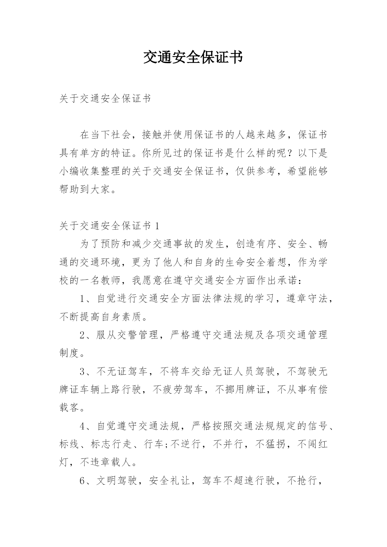 交通安全保证书关于交通安全保证书在当下社会,接触并使用保证书的人越来越多,保证书具有单方的特证。你所见过的保证书是什么样的呢?以下是小编收集整理的关于交通安全保证书,仅供参考,希望能够帮助到大家。关于交通安全保证书1为了预防和减少交通事故的发生,创造有序、安全、畅通的交通环境,更为了他人和自身的生命安全着想,作为学校的一名教师,我愿意在遵守交通安全方面作出承诺:1、自觉进行交通安全方面法律法规的学习,遵章守法,不断提高自身素质。2、服从交警管理,严格遵守交通法规及各项交通管理制度。3、不无证驾车,不将车交