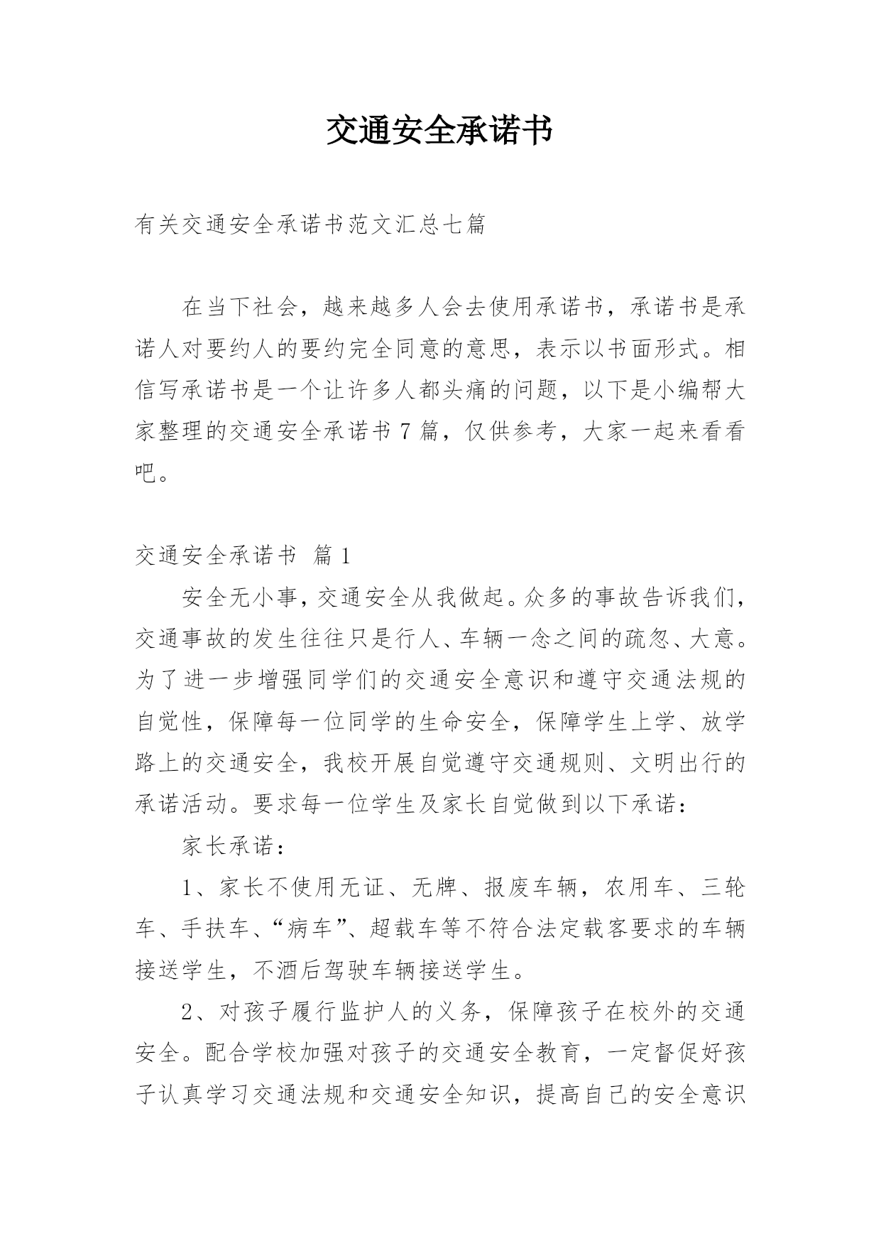 交通安全承诺书有关交通安全承诺书范文汇总七篇在当下社会,越来越多人会去使用承诺书,承诺书是承诺人对要约人的要约完全同意的意思,表示以书面形式。相信写承诺书是一个让许多人都头痛的问题,以下是小编帮大家整理的交通安全承诺书7篇,仅供参考,大家一起来看看吧。交通安全承诺书篇1安全无小事,交通安全从我做起。众多的事故告诉我们,交通事故的发生往往只是行人、车辆一念之间的疏忽、大意。为了进一步增强同学们的交通安全意识和遵守交通法规的自觉性,保障每一位同学的生命安全,保障学生上学、放学路上的交通安全,我校开展自觉遵守交