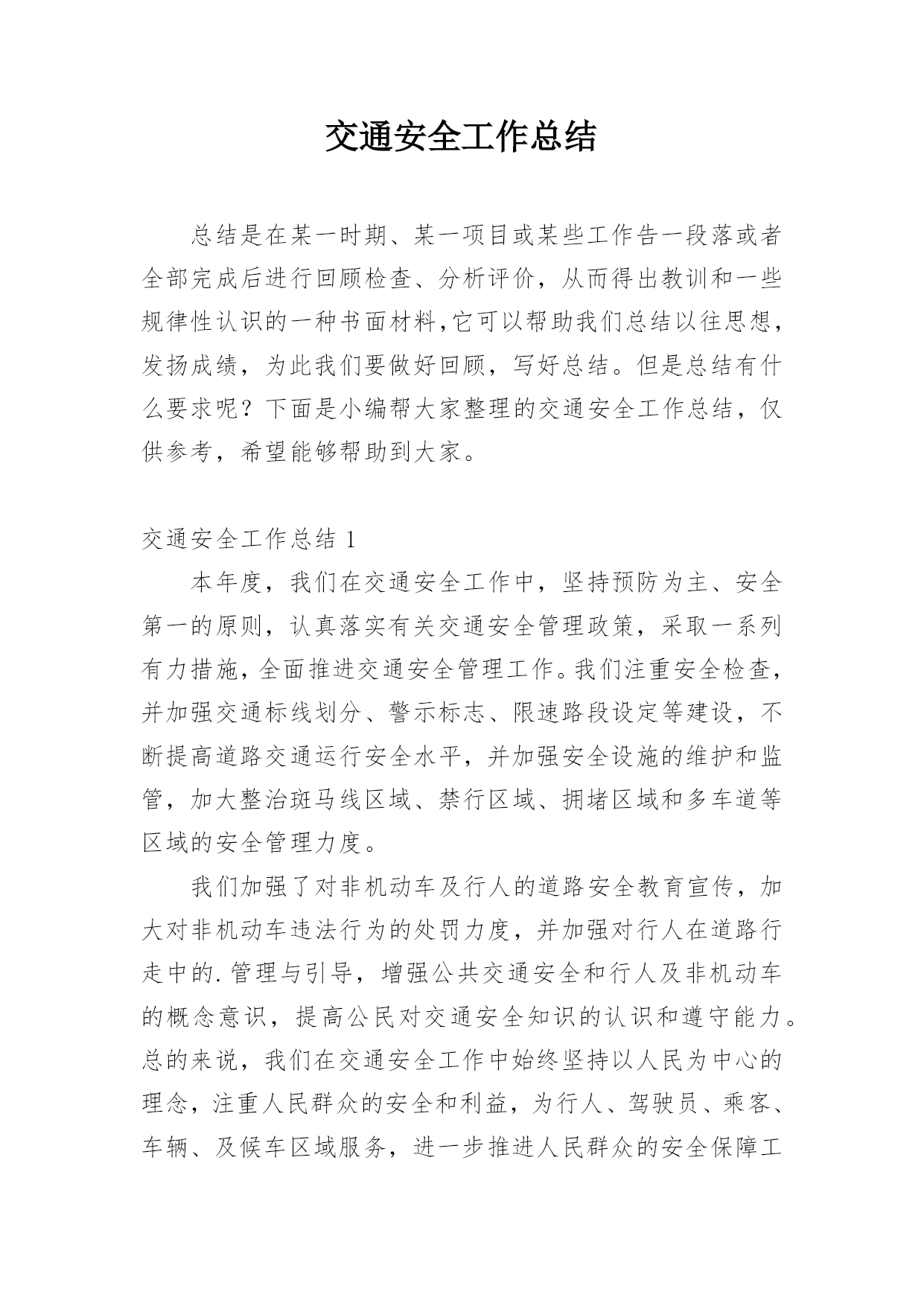 交通安全工作总结总结是在某一时期、某一项目或某些工作告一段落或者全部完成后进行回顾检查、分析评价,从而得出教训和一些规律性认识的一种书面材料,它可以帮助我们总结以往思想,发扬成绩,为此我们要做好回顾,写好总结。但是总结有什么要求呢?下面是小编帮大家整理的交通安全工作总结,仅供参考,希望能够帮助到大家。交通安全工作总结1本年度,我们在交通安全工作中,坚持预防为主、安全第一的原则,认真落实有关交通安全管理政策,采取一系列有力措施,全面推进交通安全管理工作。我们注重安全检查,并加强交通标线划分、警示标志、限速路