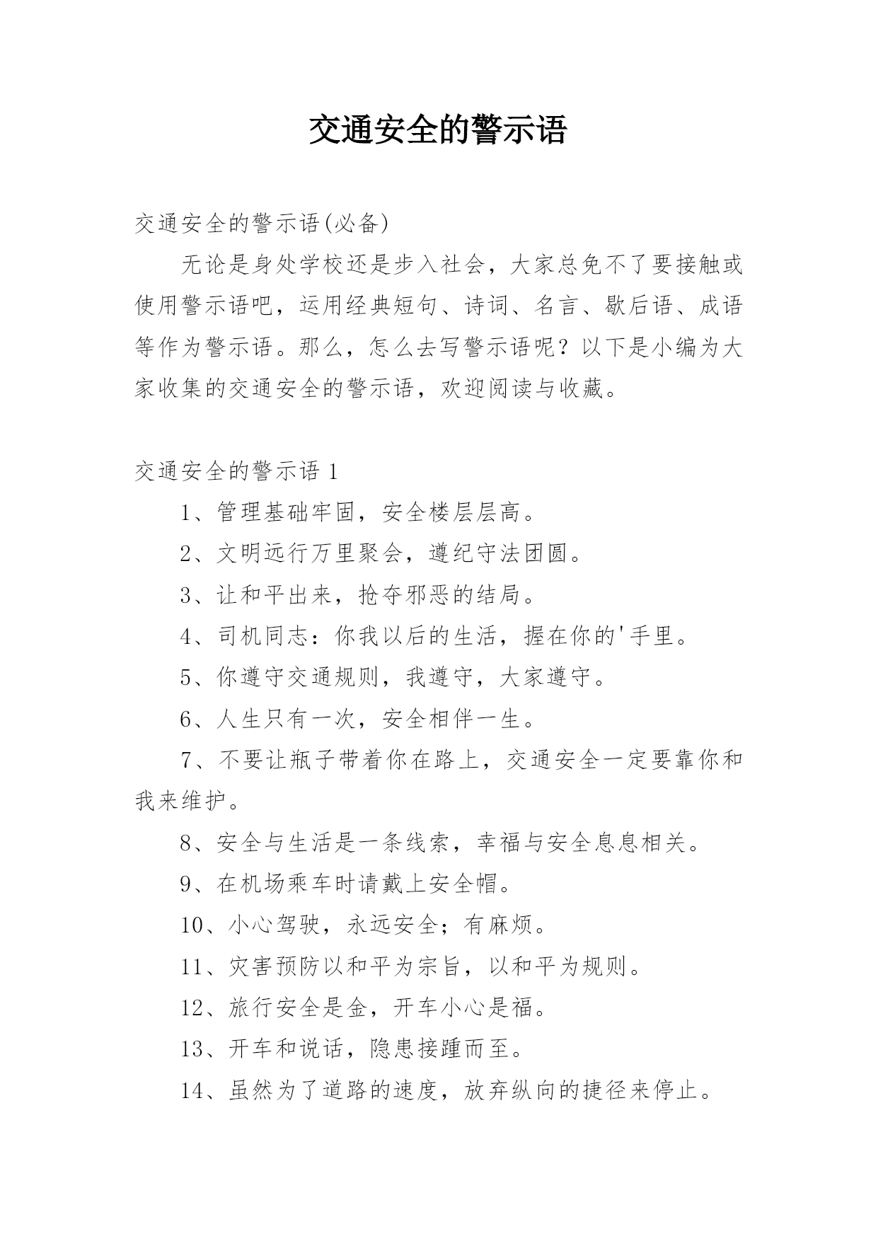 交通安全的警示语交通安全的警示语(必备)无论是身处学校还是步入社会,大家总免不了要接触或使用警示语吧,运用经典短句、诗词、名言、歇后语、成语等作为警示语。那么,怎么去写警示语呢?以下是小编为大家收集的交通安全的警示语,欢迎阅读与收藏。交通安全的警示语11、管理基础牢固,安全楼层层高。2、文明远行万里聚会,遵纪守法团圆。3、让和平出来,抢夺邪恶的结局。4、司机同志:你我以后的生活,握在你的'手里。5、你遵守交通规则,我遵守,大家遵守。6、人生只有一次,安全相伴一生。7、不要让瓶子带着你在路上,交通安全一定要