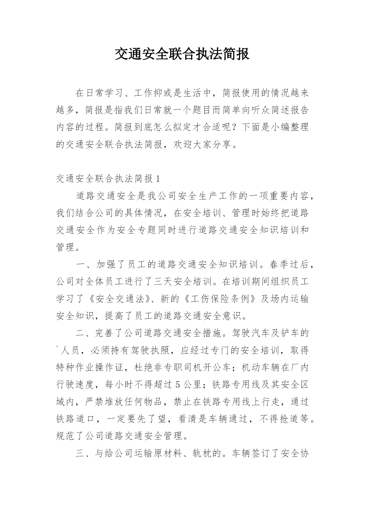 交通安全联合执法简报在日常学习、工作抑或是生活中,简报使用的情况越来越多,简报是指我们日常就一个题目而简单向听众简述报告内容的过程。简报到底怎么拟定才合适呢?下面是小编整理的交通安全联合执法简报,欢迎大家分享。交通安全联合执法简报1道路交通安全是我公司安全生产工作的一项重要内容,我们结合公司的具体情况,在安全培训、管理时始终把道路交通安全作为安全专题同时进行道路交通安全知识培训和管理。一、加强了员工的道路交通安全知识培训。春季过后,公司对全体员工进行了三天安全培训。在培训期间组织员工学习了《安全交通法》、