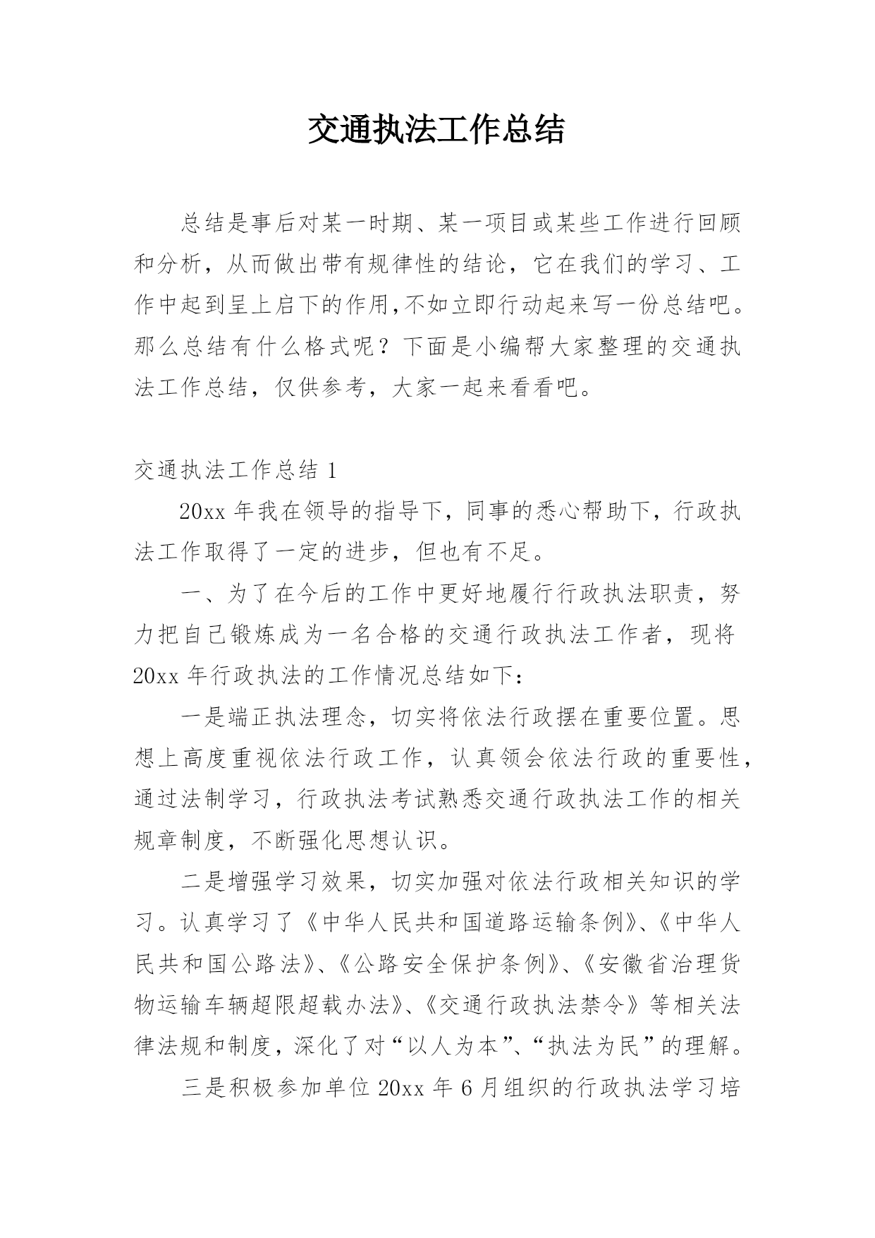 交通执法工作总结总结是事后对某一时期、某一项目或某些工作进行回顾和分析,从而做出带有规律性的结论,它在我们的学习、工作中起到呈上启下的作用,不如立即行动起来写一份总结吧。那么总结有什么格式呢?下面是小编帮大家整理的交通执法工作总结,仅供参考,大家一起来看看吧。交通执法工作总结120xx年我在领导的指导下,同事的悉心帮助下,行政执法工作取得了一定的进步,但也有不足。一、为了在今后的工作中更好地履行行政执法职责,努力把自己锻炼成为一名合格的交通行政执法工作者,现将20xx年行政执法的工作情况总结如下:一是端正