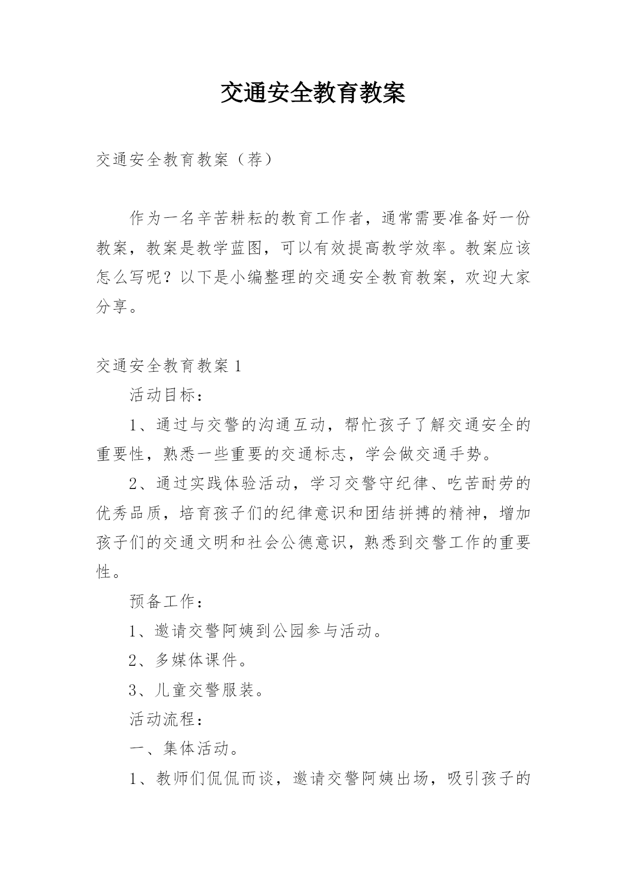 交通安全教育教案交通安全教育教案(荐)作为一名辛苦耕耘的教育工作者,通常需要准备好一份教案,教案是教学蓝图,可以有效提高教学效率。教案应该怎么写呢?以下是小编整理的交通安全教育教案,欢迎大家分享。交通安全教育教案1活动目标:1、通过与交警的沟通互动,帮忙孩子了解交通安全的重要性,熟悉一些重要的交通标志,学会做交通手势。2、通过实践体验活动,学习交警守纪律、吃苦耐劳的优秀品质,培育孩子们的纪律意识和团结拼搏的精神,增加孩子们的交通文明和社会公德意识,熟悉到交警工作的重要性。预备工作:1、邀请交警阿姨到公园参