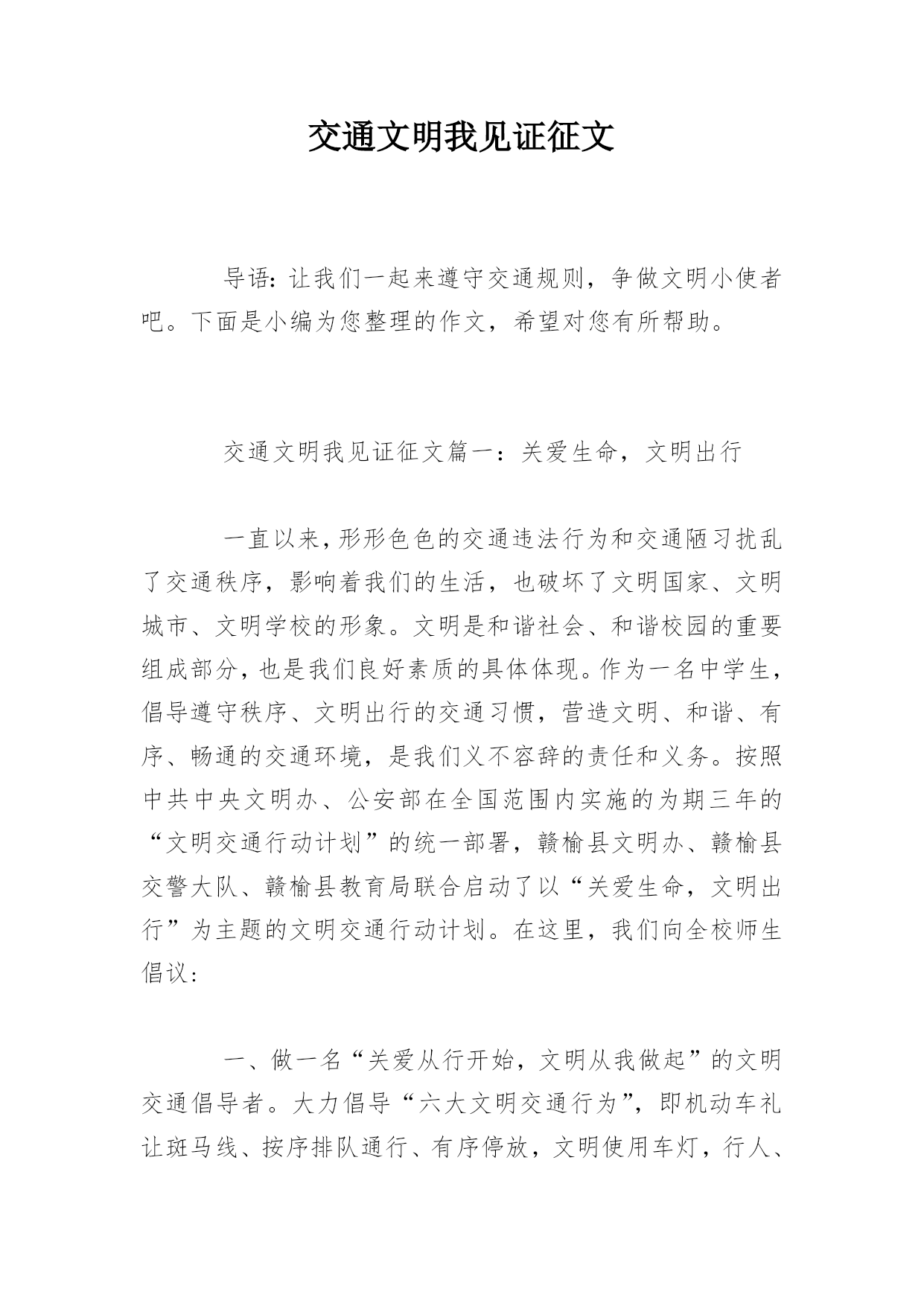 交通文明我见证征文导语:让我们一起来遵守交通规则,争做文明小使者吧。下面是小编为您整理的作文,希望对您有所帮助。交通文明我见证征文篇一:关爱生命,文明出行一直以来,形形色色的交通违法行为和交通陋习扰乱了交通秩序,影响着我们的生活,也破坏了文明国家、文明城市、文明学校的形象。文明是和谐社会、和谐校园的重要组成部分,也是我们良好素质的具体体现。作为一名中学生,倡导遵守秩序、文明出行的交通习惯,营造文明、和谐、有序、畅通的交通环境,是我们义不容辞的责任和义务。按照中共中央文明办、公安部在全国范围内实施的为期三年