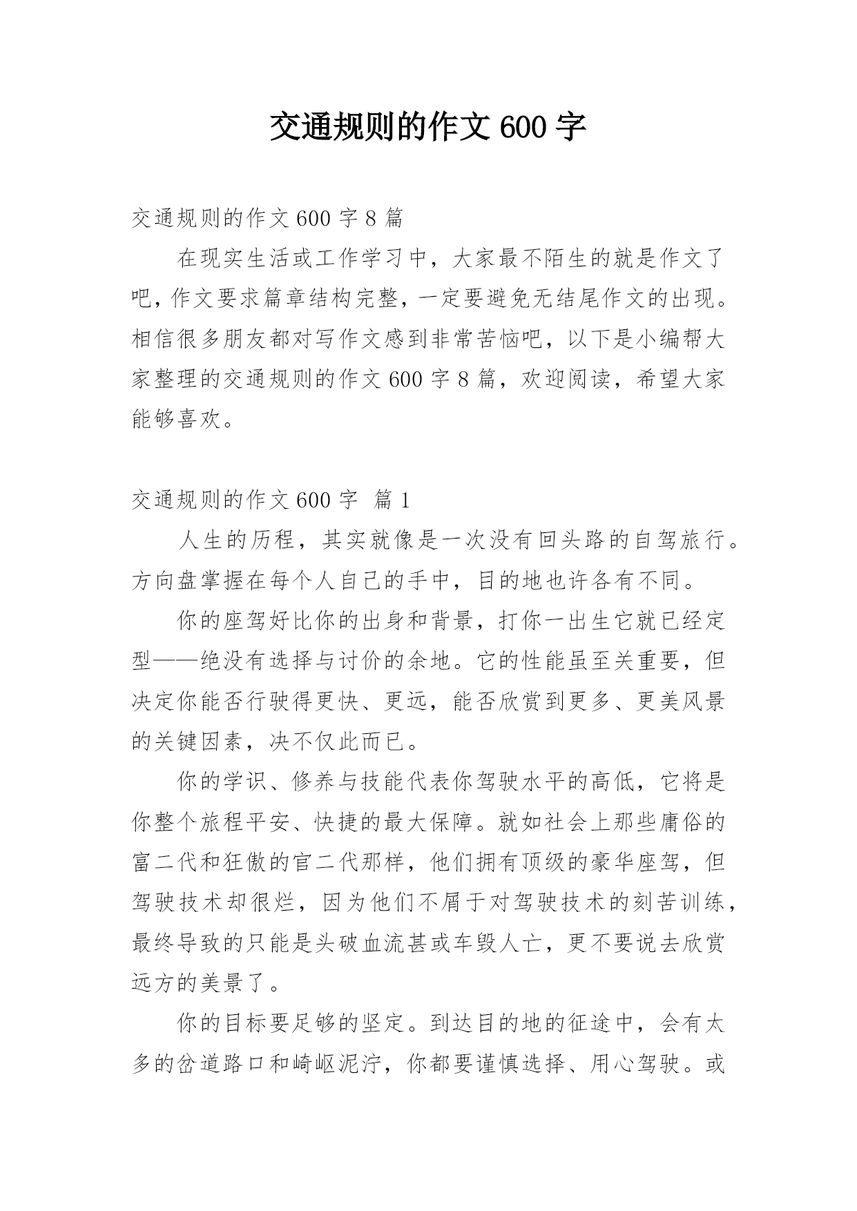 交通规则的作文600字交通规则的作文600字8篇在现实生活或工作学习中,大家最不陌生的就是作文了吧,作文要求篇章结构完整,一定要避免无结尾作文的出现。相信很多朋友都对写作文感到非常苦恼吧,以下是小编帮大家整理的交通规则的作文600字8篇,欢迎阅读,希望大家能够喜欢。交通规则的作文600字篇1人生的历程,其实就像是一次没有回头路的自驾旅行。方向盘掌握在每个人自己的手中,目的地也许各有不同。你的座驾好比你的出身和背景,打你一出生它就已经定型——绝没有选择与讨价的余地。它的性能虽至关重要,但决定你能否行驶得更快