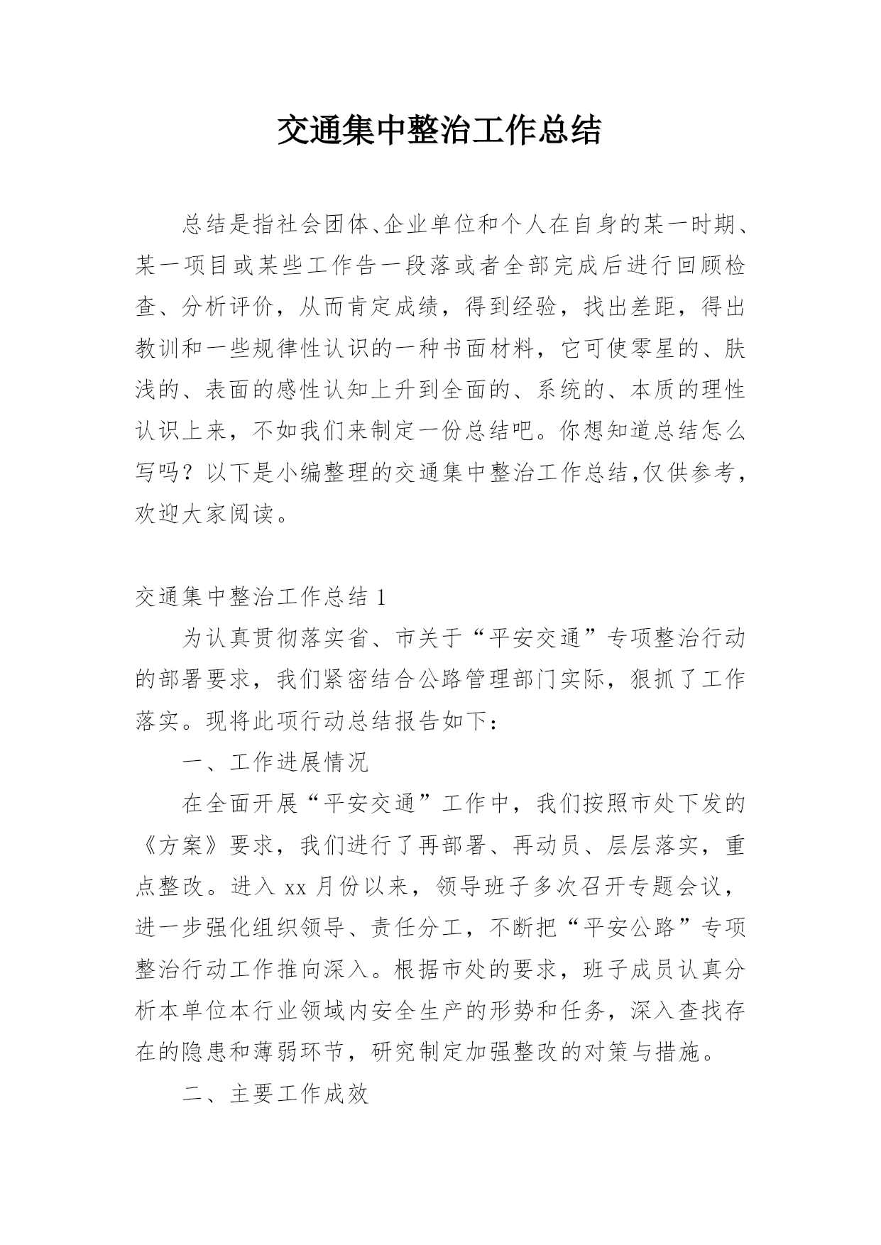交通集中整治工作总结总结是指社会团体、企业单位和个人在自身的某一时期、某一项目或某些工作告一段落或者全部完成后进行回顾检查、分析评价,从而肯定成绩,得到经验,找出差距,得出教训和一些规律性认识的一种书面材料,它可使零星的、肤浅的、表面的感性认知上升到全面的、系统的、本质的理性认识上来,不如我们来制定一份总结吧。你想知道总结怎么写吗?以下是小编整理的交通集中整治工作总结,仅供参考,欢迎大家阅读。交通集中整治工作总结1为认真贯彻落实省、市关于“平安交通”专项整治行动的部署要求,我们紧密结合公路管理部门实际,狠
