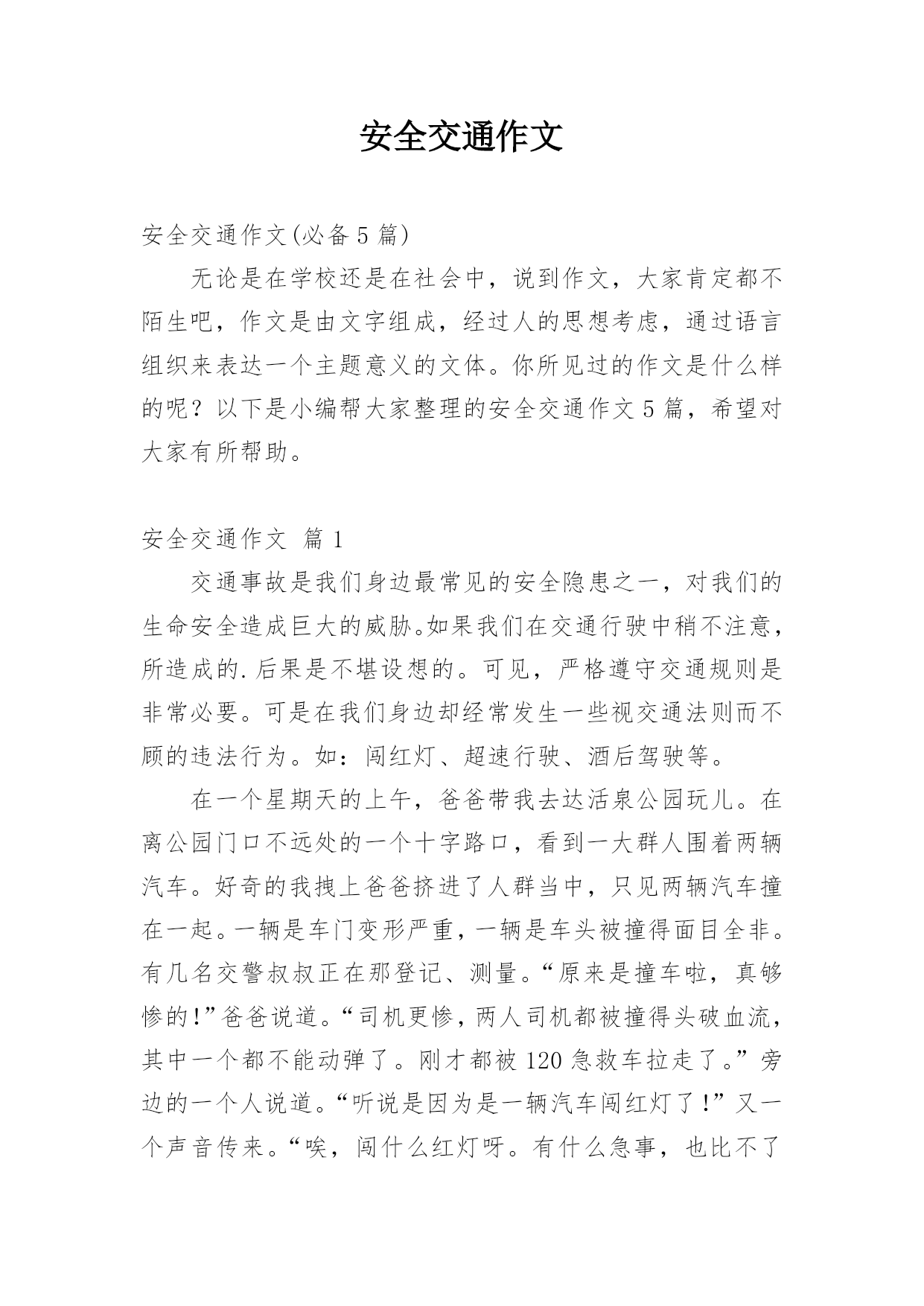 安全交通作文安全交通作文(必备5篇)无论是在学校还是在社会中,说到作文,大家肯定都不陌生吧,作文是由文字组成,经过人的思想考虑,通过语言组织来表达一个主题意义的文体。你所见过的作文是什么样的呢?以下是小编帮大家整理的安全交通作文5篇,希望对大家有所帮助。安全交通作文篇1交通事故是我们身边最常见的安全隐患之一,对我们的生命安全造成巨大的威胁。如果我们在交通行驶中稍不注意,所造成的.后果是不堪设想的。可见,严格遵守交通规则是非常必要。可是在我们身边却经常发生一些视交通法则而不顾的违法行为。如:闯红灯、超速行驶