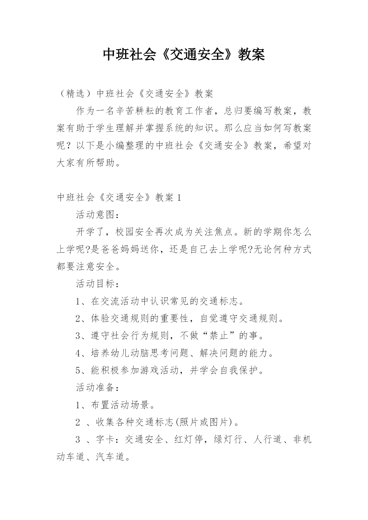 中班社会《交通安全》教案(精选)中班社会《交通安全》教案作为一名辛苦耕耘的教育工作者,总归要编写教案,教案有助于学生理解并掌握系统的知识。那么应当如何写教案呢?以下是小编整理的中班社会《交通安全》教案,希望对大家有所帮助。中班社会《交通安全》教案1活动意图:开学了,校园安全再次成为关注焦点。新的学期你怎么上学呢?是爸爸妈妈送你,还是自己去上学呢?无论何种方式都要注意安全。活动目标:1、在交流活动中认识常见的交通标志。2、体验交通规则的重要性,自觉遵守交通规则。3、遵守社会行为规则,不做“禁止”的事。4、培