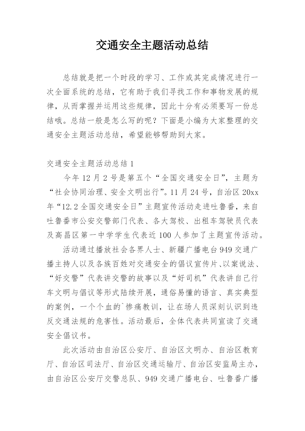 交通安全主题活动总结总结就是把一个时段的学习、工作或其完成情况进行一次全面系统的总结,它有助于我们寻找工作和事物发展的规律,从而掌握并运用这些规律,因此十分有必须要写一份总结哦。总结一般是怎么写的呢?下面是小编为大家整理的交通安全主题活动总结,希望能够帮助到大家。交通安全主题活动总结1今年12月2号是第五个“全国交通安全日”,主题为“社会协同治理、安全文明出行”。11月24号,自治区20xx年“12.2全国交通安全日”主题宣传活动走进吐鲁番,来自吐鲁番市公安交警部门代表、各大驾校、出租车驾驶员代表及高昌区
