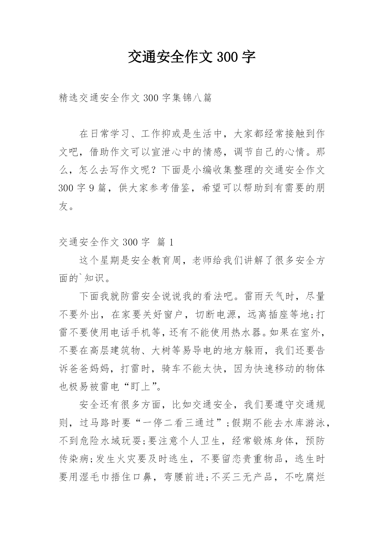 交通安全作文300字精选交通安全作文300字集锦八篇在日常学习、工作抑或是生活中,大家都经常接触到作文吧,借助作文可以宣泄心中的情感,调节自己的心情。那么,怎么去写作文呢?下面是小编收集整理的交通安全作文300字9篇,供大家参考借鉴,希望可以帮助到有需要的朋友。交通安全作文300字篇1这个星期是安全教育周,老师给我们讲解了很多安全方面的`知识。下面我就防雷安全说说我的看法吧。雷雨天气时,尽量不要外出,在家要关好窗户,切断电源,远离插座等地;打雷不要使用电话手机等,还有不能使用热水器。如果在室外,不要在高层