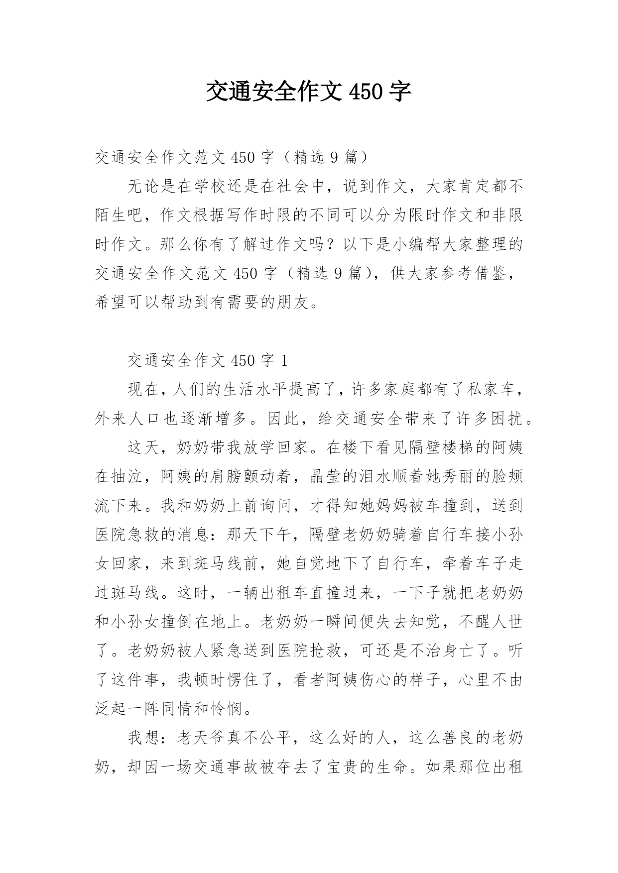 交通安全作文450字交通安全作文范文450字(精选9篇)无论是在学校还是在社会中,说到作文,大家肯定都不陌生吧,作文根据写作时限的不同可以分为限时作文和非限时作文。那么你有了解过作文吗?以下是小编帮大家整理的交通安全作文范文450字(精选9篇),供大家参考借鉴,希望可以帮助到有需要的朋友。交通安全作文450字1现在,人们的生活水平提高了,许多家庭都有了私家车,外来人口也逐渐增多。因此,给交通安全带来了许多困扰。这天,奶奶带我放学回家。在楼下看见隔壁楼梯的阿姨在抽泣,阿姨的肩膀颤动着,晶莹的泪水顺着她秀丽的