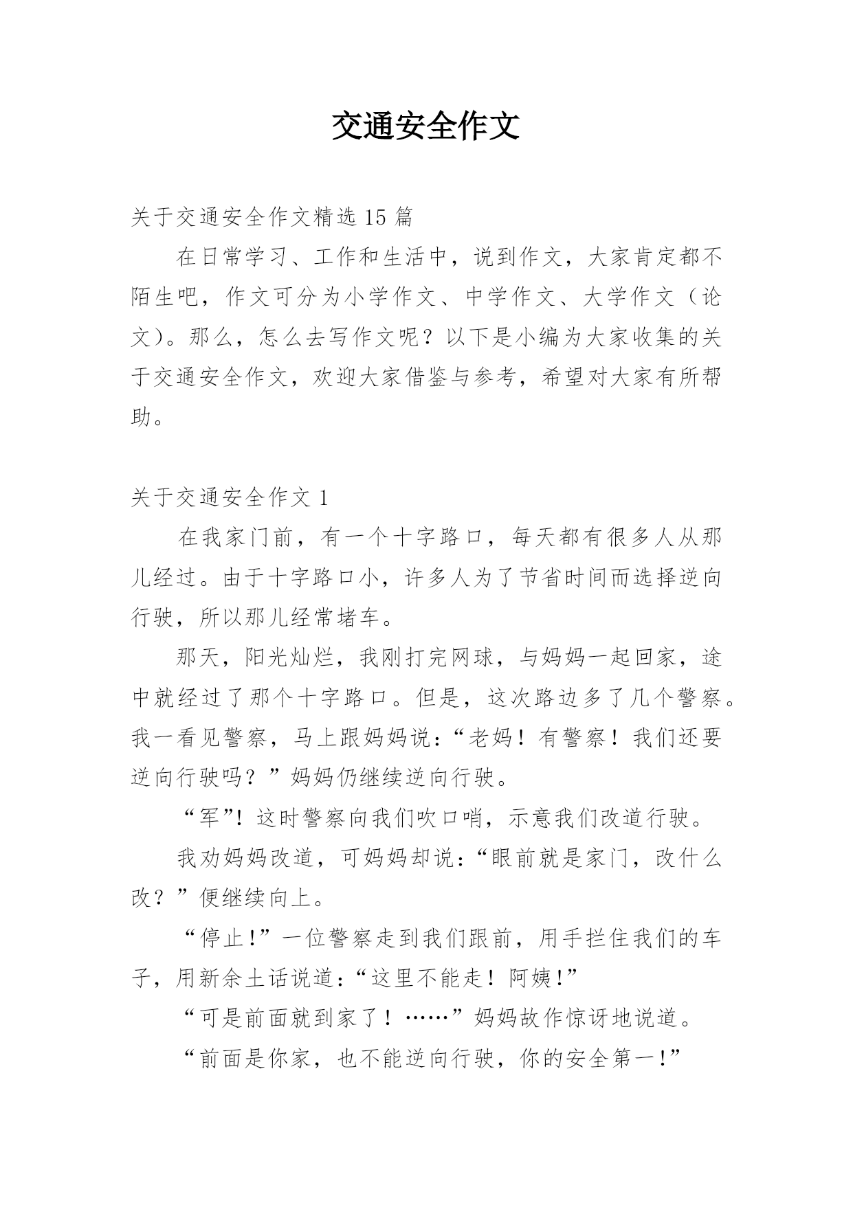 交通安全作文关于交通安全作文精选15篇在日常学习、工作和生活中,说到作文,大家肯定都不陌生吧,作文可分为小学作文、中学作文、大学作文(论文)。那么,怎么去写作文呢?以下是小编为大家收集的关于交通安全作文,欢迎大家借鉴与参考,希望对大家有所帮助。关于交通安全作文1在我家门前,有一个十字路口,每天都有很多人从那儿经过。由于十字路口小,许多人为了节省时间而选择逆向行驶,所以那儿经常堵车。那天,阳光灿烂,我刚打完网球,与妈妈一起回家,途中就经过了那个十字路口。但是,这次路边多了几个警察。我一看见警察,马上跟妈妈说
