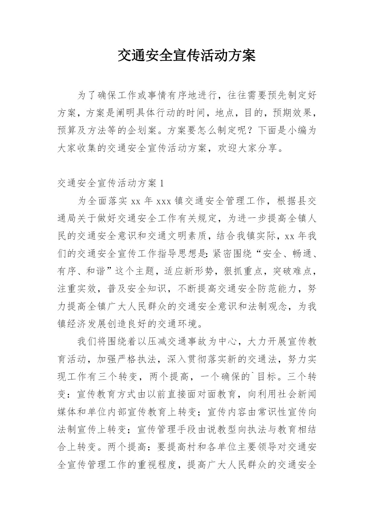 交通安全宣传活动方案为了确保工作或事情有序地进行,往往需要预先制定好方案,方案是阐明具体行动的时间,地点,目的,预期效果,预算及方法等的企划案。方案要怎么制定呢?下面是小编为大家收集的交通安全宣传活动方案,欢迎大家分享。交通安全宣传活动方案1为全面落实xx年xxx镇交通安全管理工作,根据县交通局关于做好交通安全工作有关规定,为进一步提高全镇人民的交通安全意识和交通文明素质,结合我镇实际,xx年我们的交通安全宣传工作指导思想是:紧密围绕“安全、畅通、有序、和谐”这个主题,适应新形势,狠抓重点,突破难点,注重