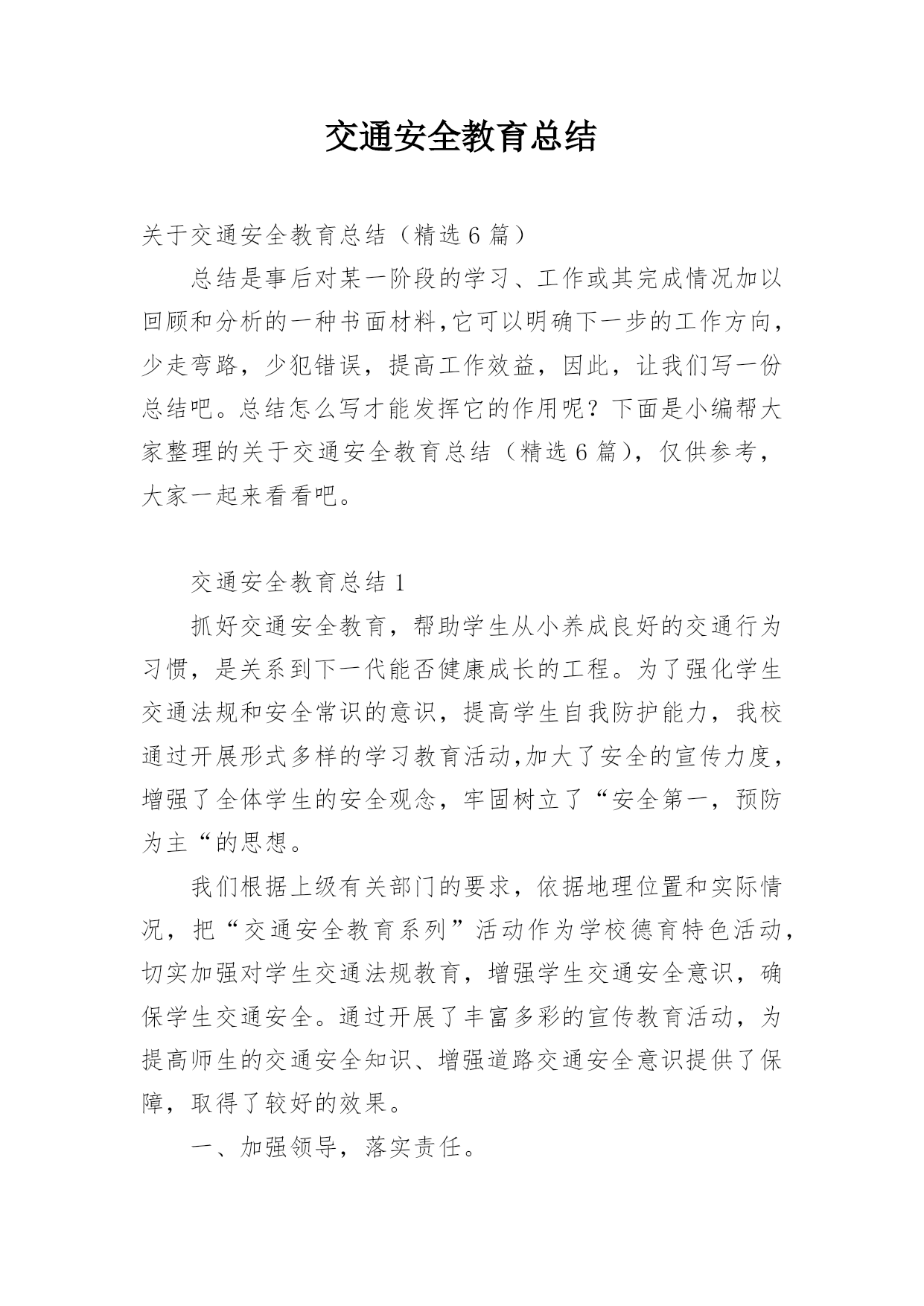 交通安全教育总结关于交通安全教育总结(精选6篇)总结是事后对某一阶段的学习、工作或其完成情况加以回顾和分析的一种书面材料,它可以明确下一步的工作方向,少走弯路,少犯错误,提高工作效益,因此,让我们写一份总结吧。总结怎么写才能发挥它的作用呢?下面是小编帮大家整理的关于交通安全教育总结(精选6篇),仅供参考,大家一起来看看吧。交通安全教育总结1抓好交通安全教育,帮助学生从小养成良好的交通行为习惯,是关系到下一代能否健康成长的工程。为了强化学生交通法规和安全常识的意识,提高学生自我防护能力,我校通过开展形式多样