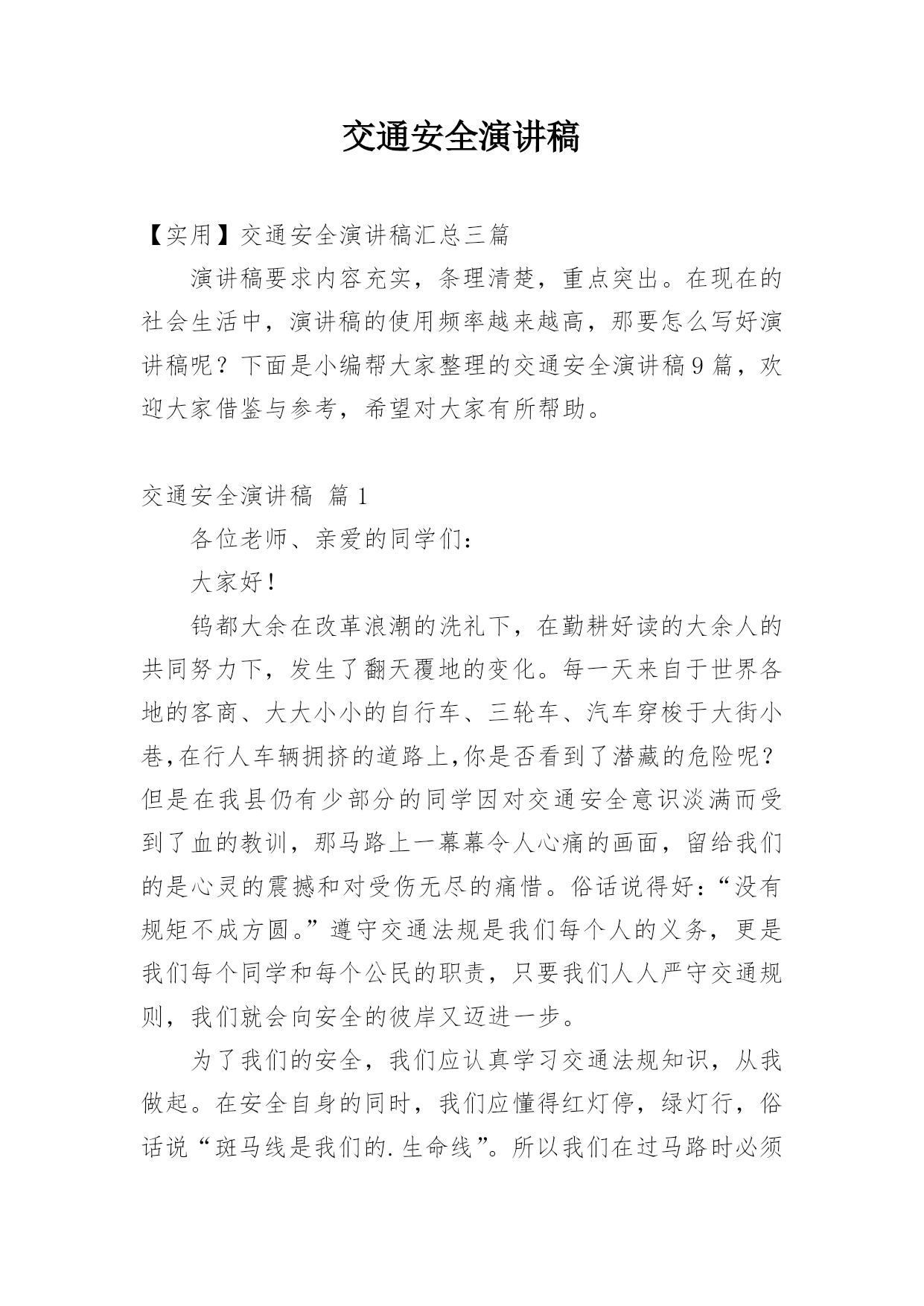 交通安全演讲稿【实用】交通安全演讲稿汇总三篇演讲稿要求内容充实,条理清楚,重点突出。在现在的社会生活中,演讲稿的使用频率越来越高,那要怎么写好演讲稿呢?下面是小编帮大家整理的交通安全演讲稿9篇,欢迎大家借鉴与参考,希望对大家有所帮助。交通安全演讲稿篇1各位老师、亲爱的同学们:大家好!钨都大余在改革浪潮的洗礼下,在勤耕好读的大余人的共同努力下,发生了翻天覆地的变化。每一天来自于世界各地的客商、大大小小的自行车、三轮车、汽车穿梭于大街小巷,在行人车辆拥挤的道路上,你是否看到了潜藏的危险呢?但是在我县仍有少部分