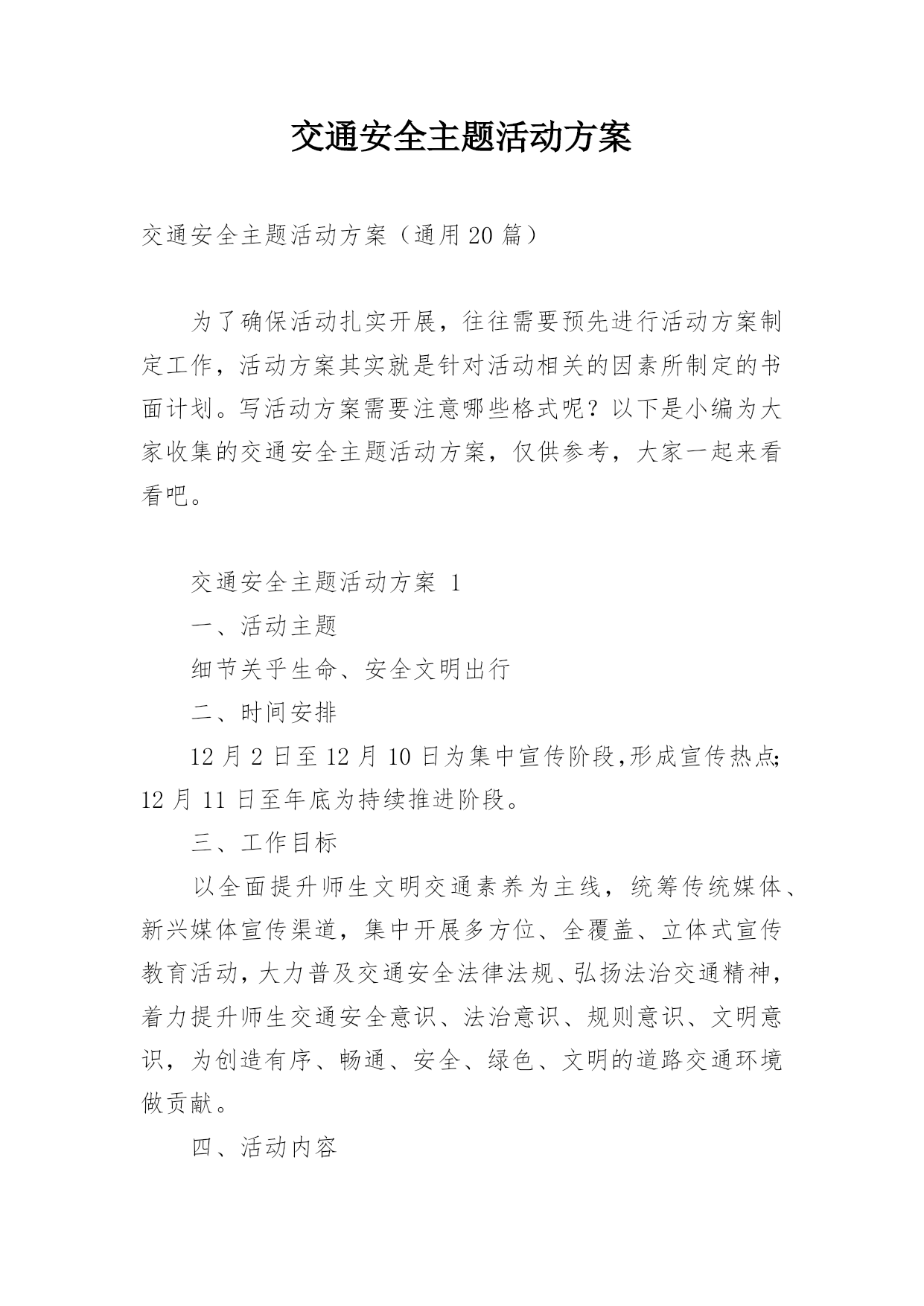 交通安全主题活动方案交通安全主题活动方案(通用20篇)为了确保活动扎实开展,往往需要预先进行活动方案制定工作,活动方案其实就是针对活动相关的因素所制定的书面计划。写活动方案需要注意哪些格式呢?以下是小编为大家收集的交通安全主题活动方案,仅供参考,大家一起来看看吧。交通安全主题活动方案1一、活动主题细节关乎生命、安全文明出行二、时间安排12月2日至12月10日为集中宣传阶段,形成宣传热点;12月11日至年底为持续推进阶段。三、工作目标以全面提升师生文明交通素养为主线,统筹传统媒体、新兴媒体宣传渠道,集中开展