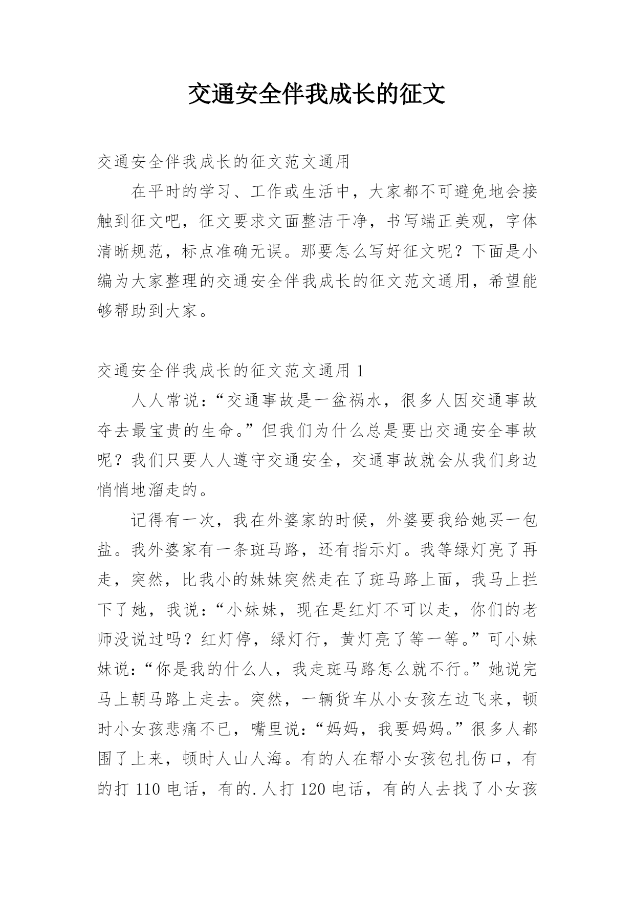 交通安全伴我成长的征文交通安全伴我成长的征文范文通用在平时的学习、工作或生活中,大家都不可避免地会接触到征文吧,征文要求文面整洁干净,书写端正美观,字体清晰规范,标点准确无误。那要怎么写好征文呢?下面是小编为大家整理的交通安全伴我成长的征文范文通用,希望能够帮助到大家。交通安全伴我成长的征文范文通用1人人常说:“交通事故是一盆祸水,很多人因交通事故夺去最宝贵的生命。”但我们为什么总是要出交通安全事故呢?我们只要人人遵守交通安全,交通事故就会从我们身边悄悄地溜走的。记得有一次,我在外婆家的时候,外婆要我给她