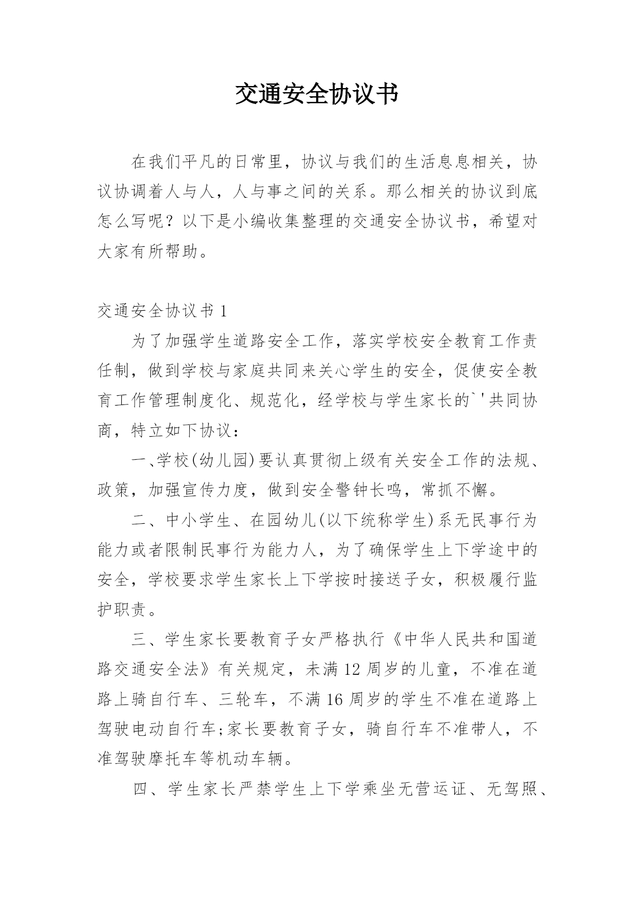交通安全协议书在我们平凡的日常里,协议与我们的生活息息相关,协议协调着人与人,人与事之间的关系。那么相关的协议到底怎么写呢?以下是小编收集整理的交通安全协议书,希望对大家有所帮助。交通安全协议书1为了加强学生道路安全工作,落实学校安全教育工作责任制,做到学校与家庭共同来关心学生的安全,促使安全教育工作管理制度化、规范化,经学校与学生家长的`'共同协商,特立如下协议:一、学校(幼儿园)要认真贯彻上级有关安全工作的法规、政策,加强宣传力度,做到安全警钟长鸣,常抓不懈。二、中小学生、在园幼儿(以下统称学生)系无