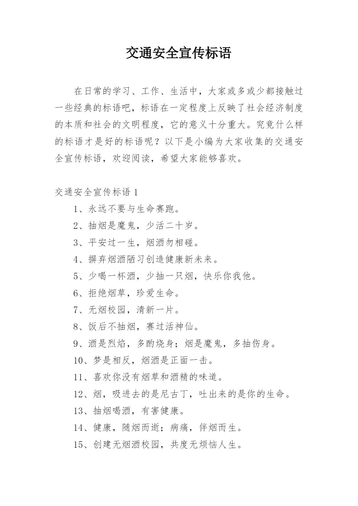 交通安全宣传标语在日常的学习、工作、生活中,大家或多或少都接触过一些经典的标语吧,标语在一定程度上反映了社会经济制度的本质和社会的文明程度,它的意义十分重大。究竟什么样的标语才是好的标语呢?以下是小编为大家收集的交通安全宣传标语,欢迎阅读,希望大家能够喜欢。交通安全宣传标语11、永远不要与生命赛跑。2、抽烟是魔鬼,少活二十岁。3、平安过一生,烟酒勿相碰。4、摒弃烟酒陋习创造健康新未来。5、少喝一杯酒,少抽一只烟,快乐你我他。6、拒绝烟草,珍爱生命。7、无烟校园,清新一片。8、饭后不抽烟,赛过活神仙。9、酒