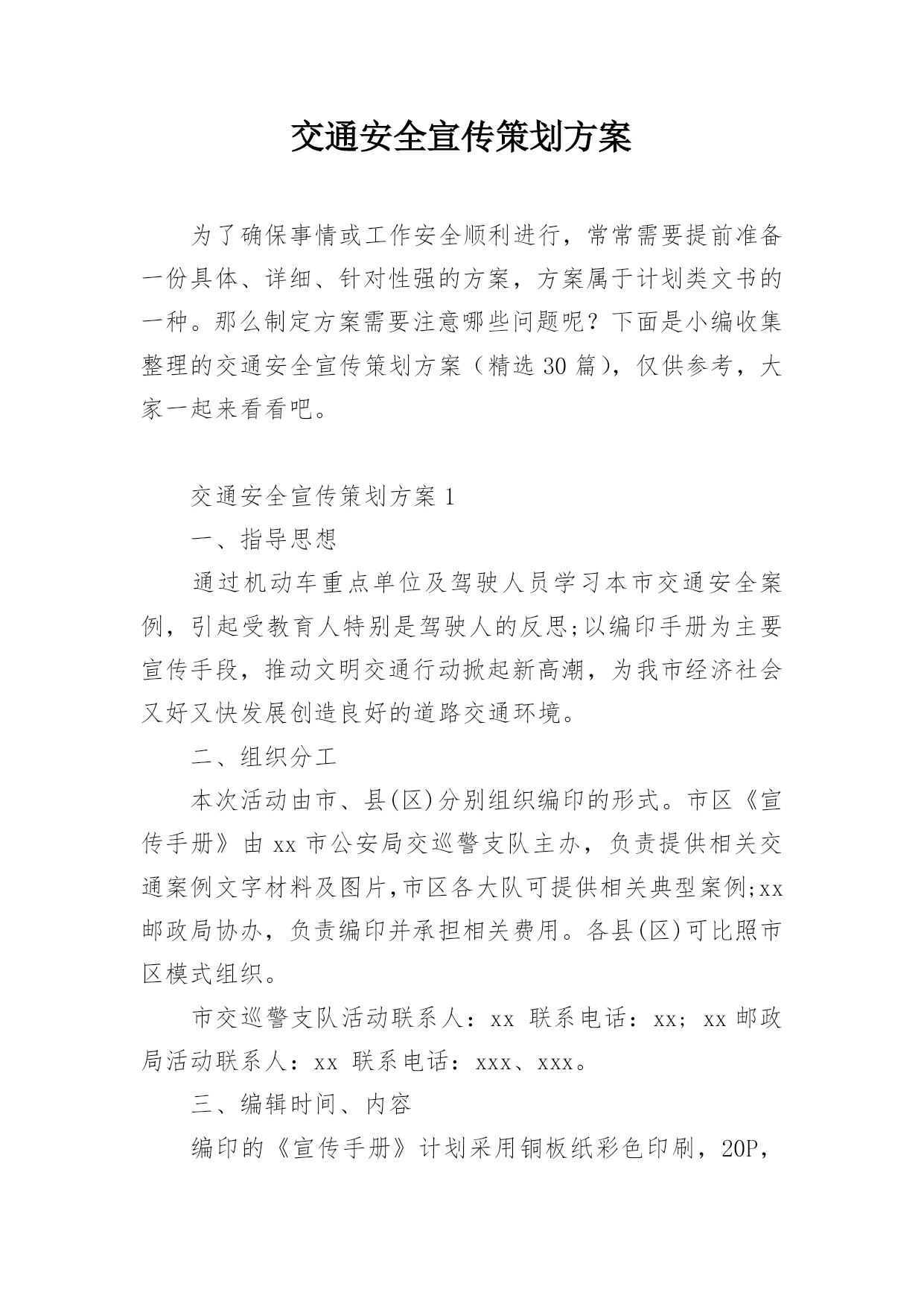 交通安全宣传策划方案为了确保事情或工作安全顺利进行,常常需要提前准备一份具体、详细、针对性强的方案,方案属于计划类文书的一种。那么制定方案需要注意哪些问题呢?下面是小编收集整理的交通安全宣传策划方案(精选30篇),仅供参考,大家一起来看看吧。交通安全宣传策划方案1一、指导思想通过机动车重点单位及驾驶人员学习本市交通安全案例,引起受教育人特别是驾驶人的反思;以编印手册为主要宣传手段,推动文明交通行动掀起新高潮,为我市经济社会又好又快发展创造良好的道路交通环境。二、组织分工本次活动由市、县(区)分别组织编印的