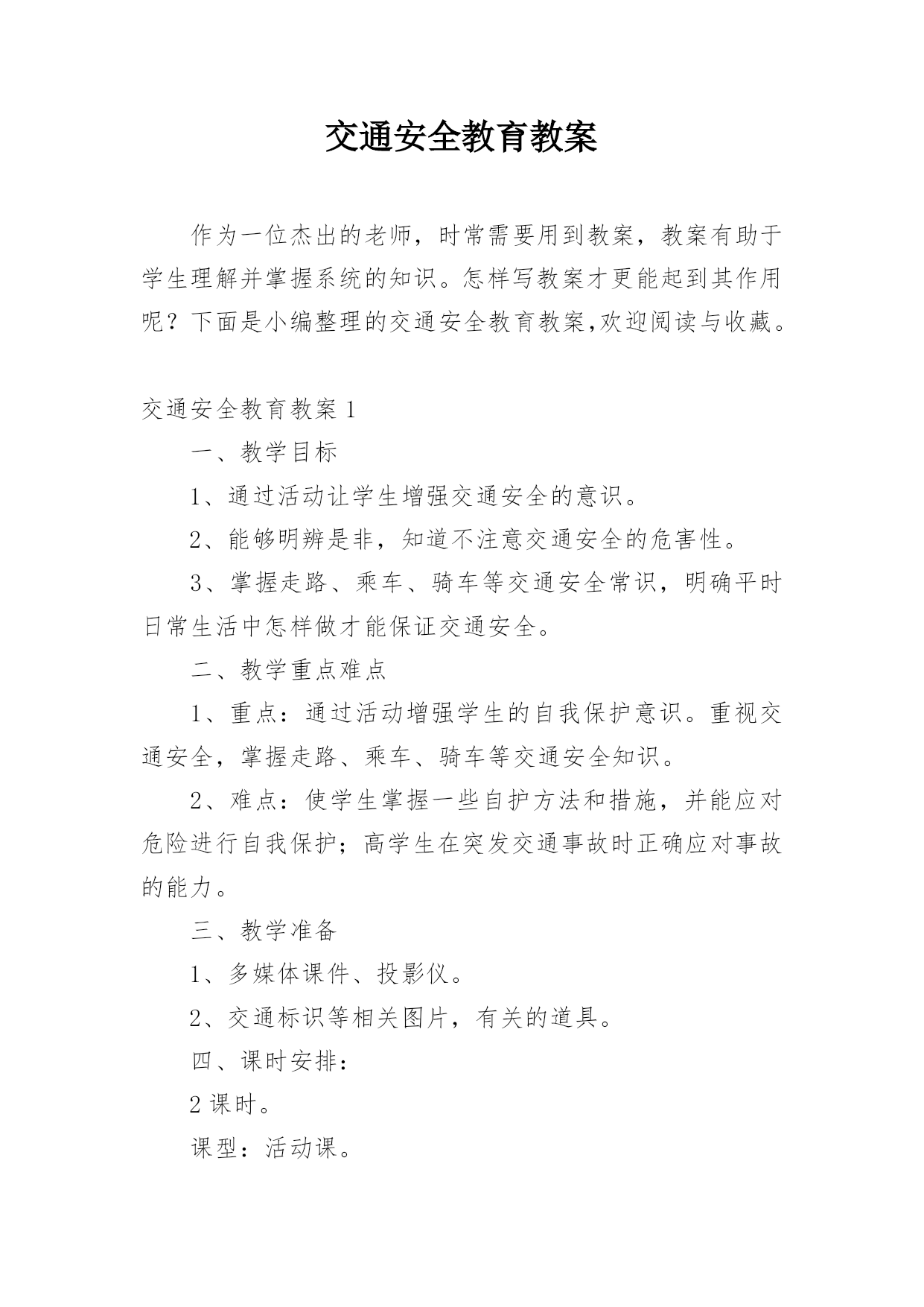 交通安全教育教案作为一位杰出的老师,时常需要用到教案,教案有助于学生理解并掌握系统的知识。怎样写教案才更能起到其作用呢?下面是小编整理的交通安全教育教案,欢迎阅读与收藏。交通安全教育教案1一、教学目标1、通过活动让学生增强交通安全的意识。2、能够明辨是非,知道不注意交通安全的危害性。3、掌握走路、乘车、骑车等交通安全常识,明确平时日常生活中怎样做才能保证交通安全。二、教学重点难点1、重点:通过活动增强学生的自我保护意识。重视交通安全,掌握走路、乘车、骑车等交通安全知识。2、难点:使学生掌握一些自护方法和措