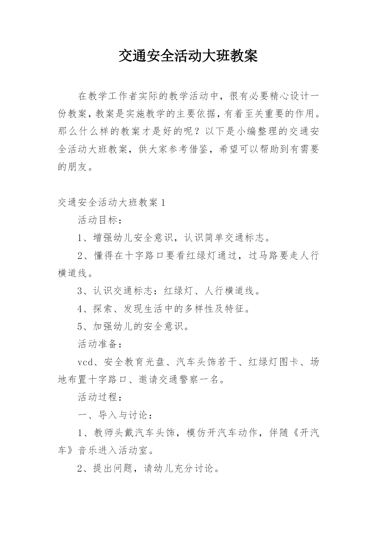 交通安全活动大班教案在教学工作者实际的教学活动中,很有必要精心设计一份教案,教案是实施教学的主要依据,有着至关重要的作用。那么什么样的教案才是好的呢?以下是小编整理的交通安全活动大班教案,供大家参考借鉴,希望可以帮助到有需要的朋友。交通安全活动大班教案1活动目标:1、增强幼儿安全意识,认识简单交通标志。2、懂得在十字路口要看红绿灯通过,过马路要走人行横道线。3、认识交通标志:红绿灯、人行横道线。4、探索、发现生活中的多样性及特征。5、加强幼儿的安全意识。活动准备:vcd、安全教育光盘、汽车头饰若干、红绿灯