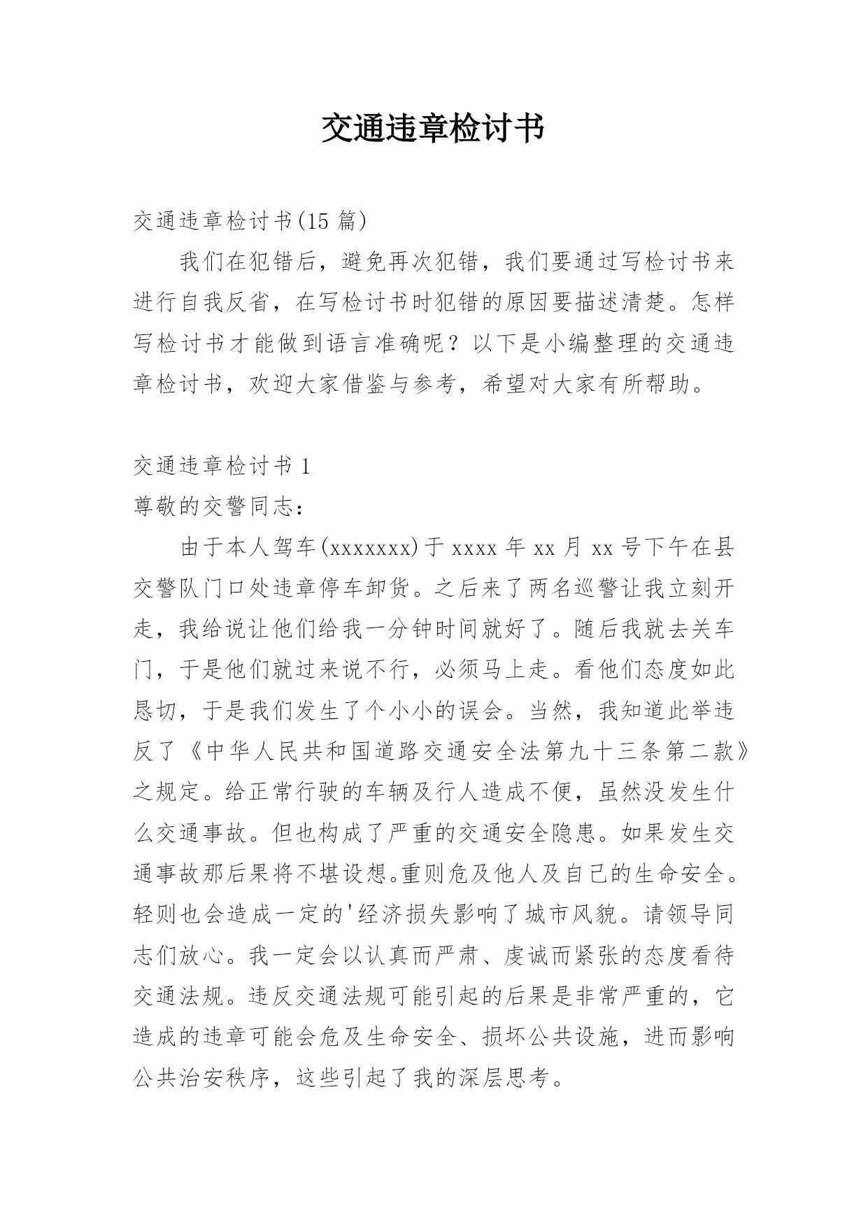 交通违章检讨书交通违章检讨书(15篇)我们在犯错后,避免再次犯错,我们要通过写检讨书来进行自我反省,在写检讨书时犯错的原因要描述清楚。怎样写检讨书才能做到语言准确呢?以下是小编整理的交通违章检讨书,欢迎大家借鉴与参考,希望对大家有所帮助。交通违章检讨书1尊敬的交警同志:由于本人驾车(xxxxxxx)于xxxx年xx月xx号下午在县交警队门口处违章停车卸货。之后来了两名巡警让我立刻开走,我给说让他们给我一分钟时间就好了。随后我就去关车门,于是他们就过来说不行,必须马上走。看他们态度如此恳切,于是我们发生了个